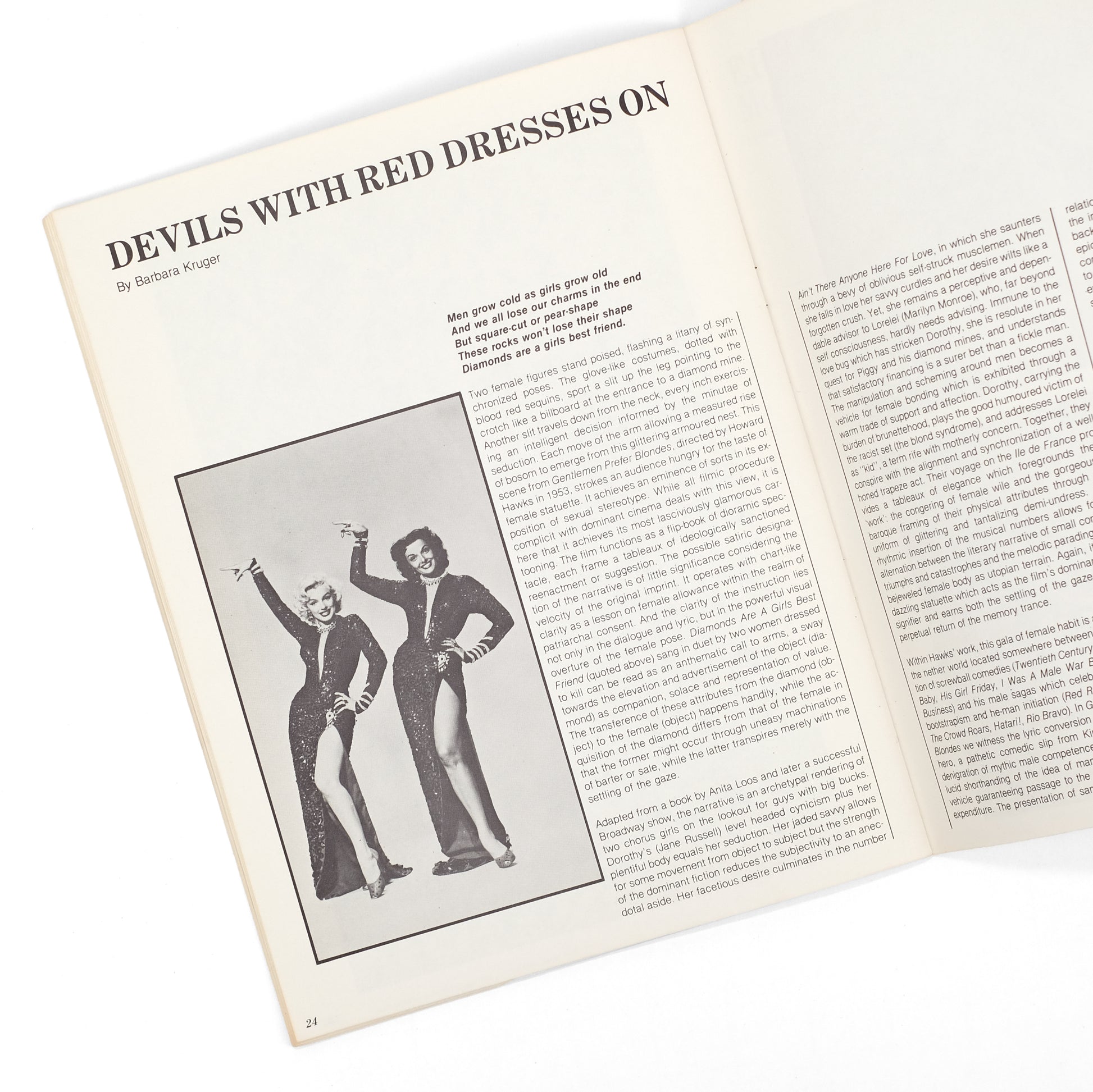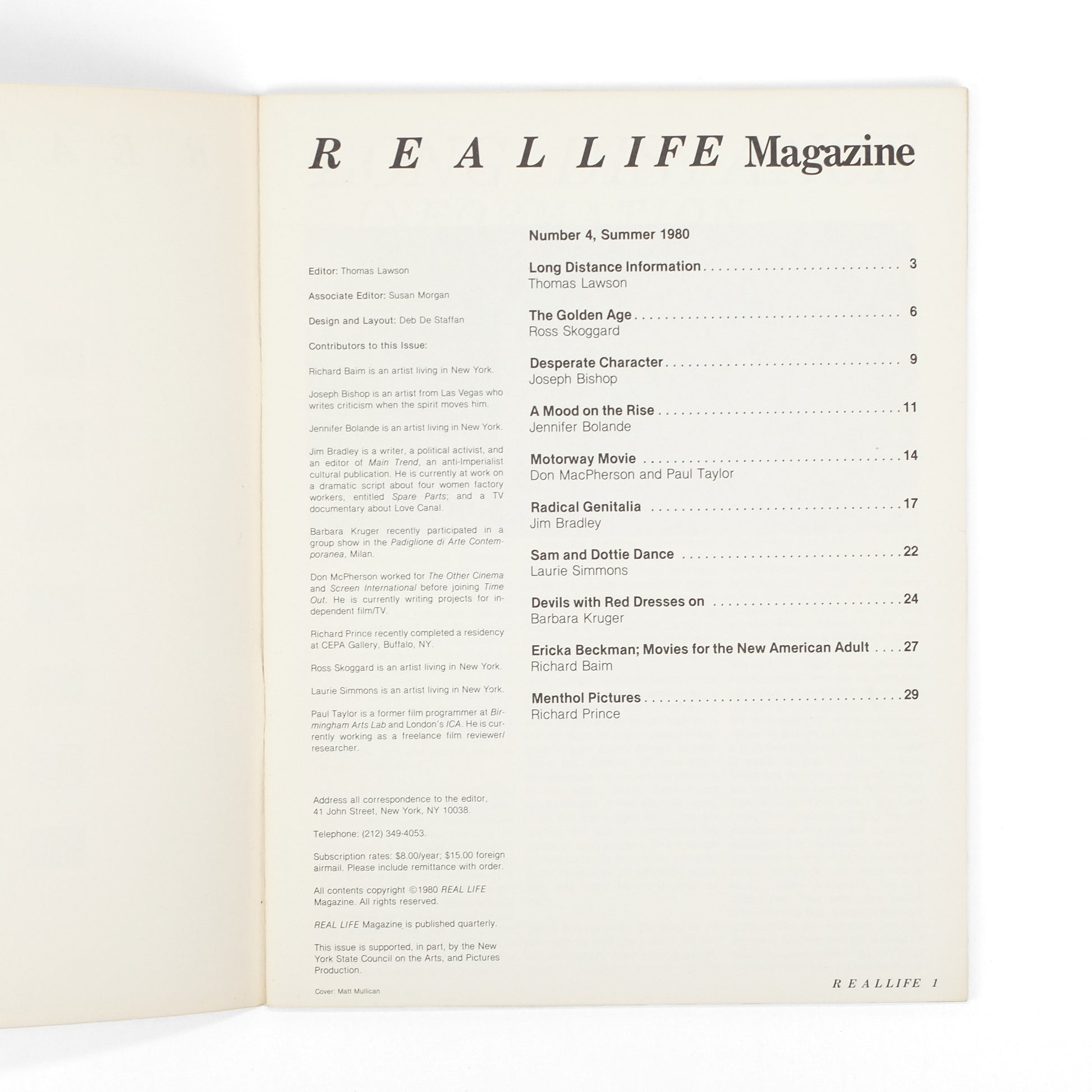 Fourth of twenty-two total issues of this New York artists' periodical, notable as a vehicle for, and with contributions by, many of the artists associated with the Pictures Generation. Contributors here include Lawson, Ross Koggard, Joseph Bishop, Jennifer Bolande, Don MacPherson and Paul Taylor, Jim Bradley, Laurie Simmons, Barbara Kruger, RIchard Baim, and Richard Prince ("Menthol Pictures"). Cover by Matt Mullican. Allen, Artists' Magazines, p. 291.