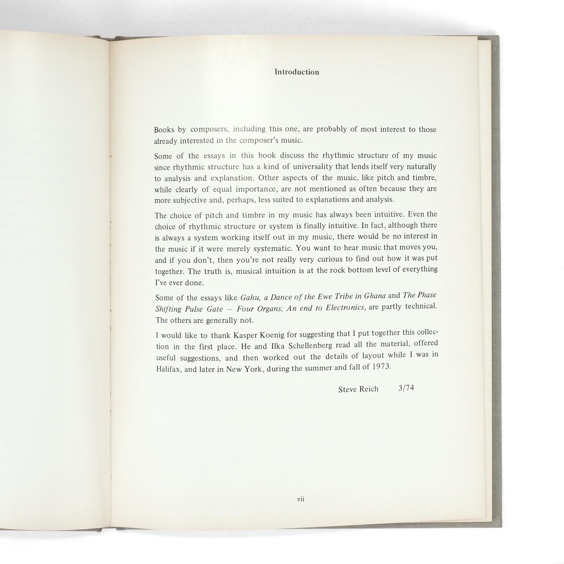 The correct first issue of this collection of writings by American composer Steve Reich (b. 1938), his first published book; essays, variously, on his aesthetic philosophy, compositional processes, studies of Ghanaian and Balinese music, etc.