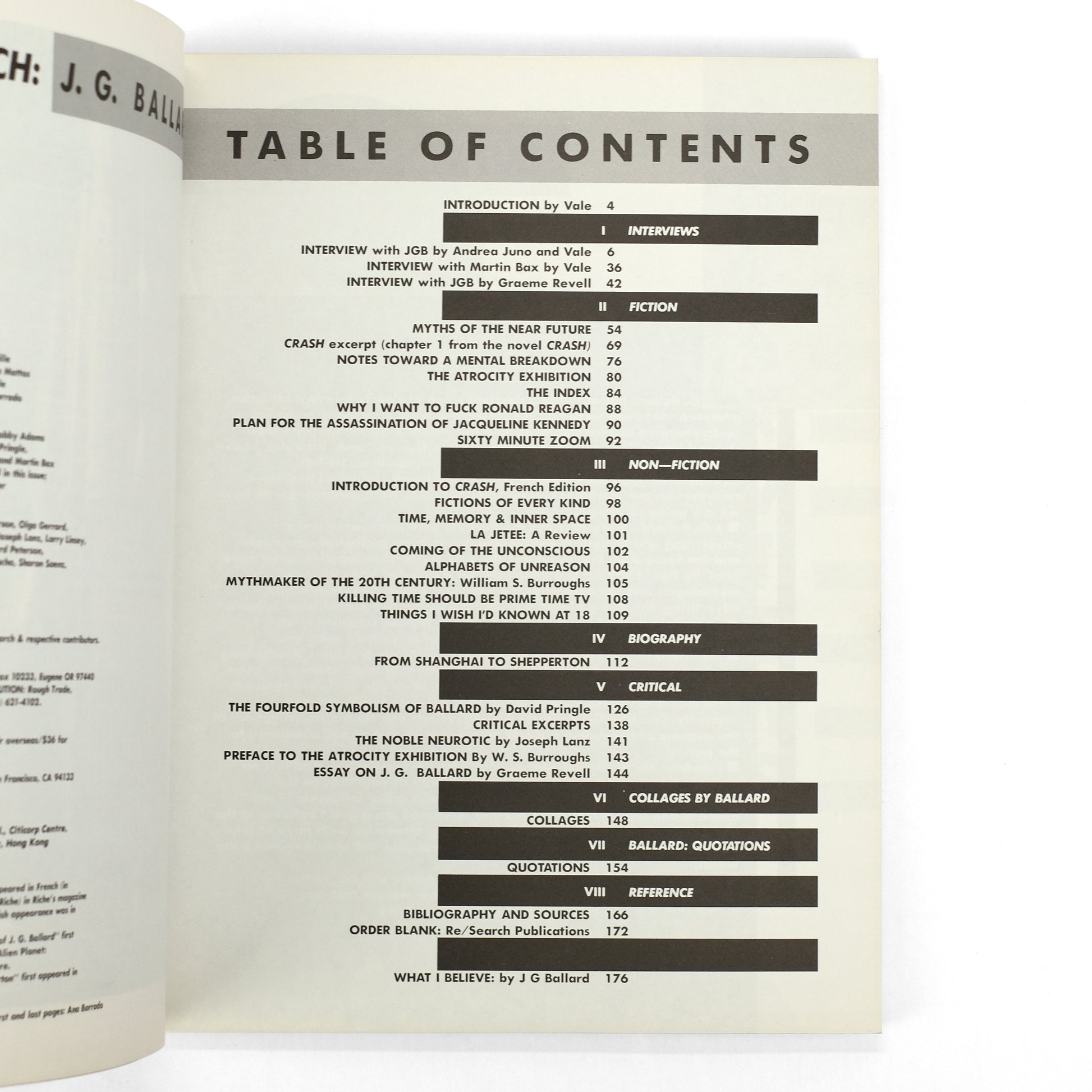 Double issue of this seminal counterculture periodical, its contents dedicated entirely to the work of English writer J. G. Ballard (1930-2009). Contents include an extensive selection of fiction and non-fiction by Ballard; three interviews with Ballard conducted respectively by Andrea Juno and Vale, Martin Bax and Vale, and Grame Revell; a biography; critical essays by David Pringle, Joseph Lanz, W. S. Burroughs, and Grame Revell; collages by Ballard; bibliography; etc. A nice copy of the first printing.
