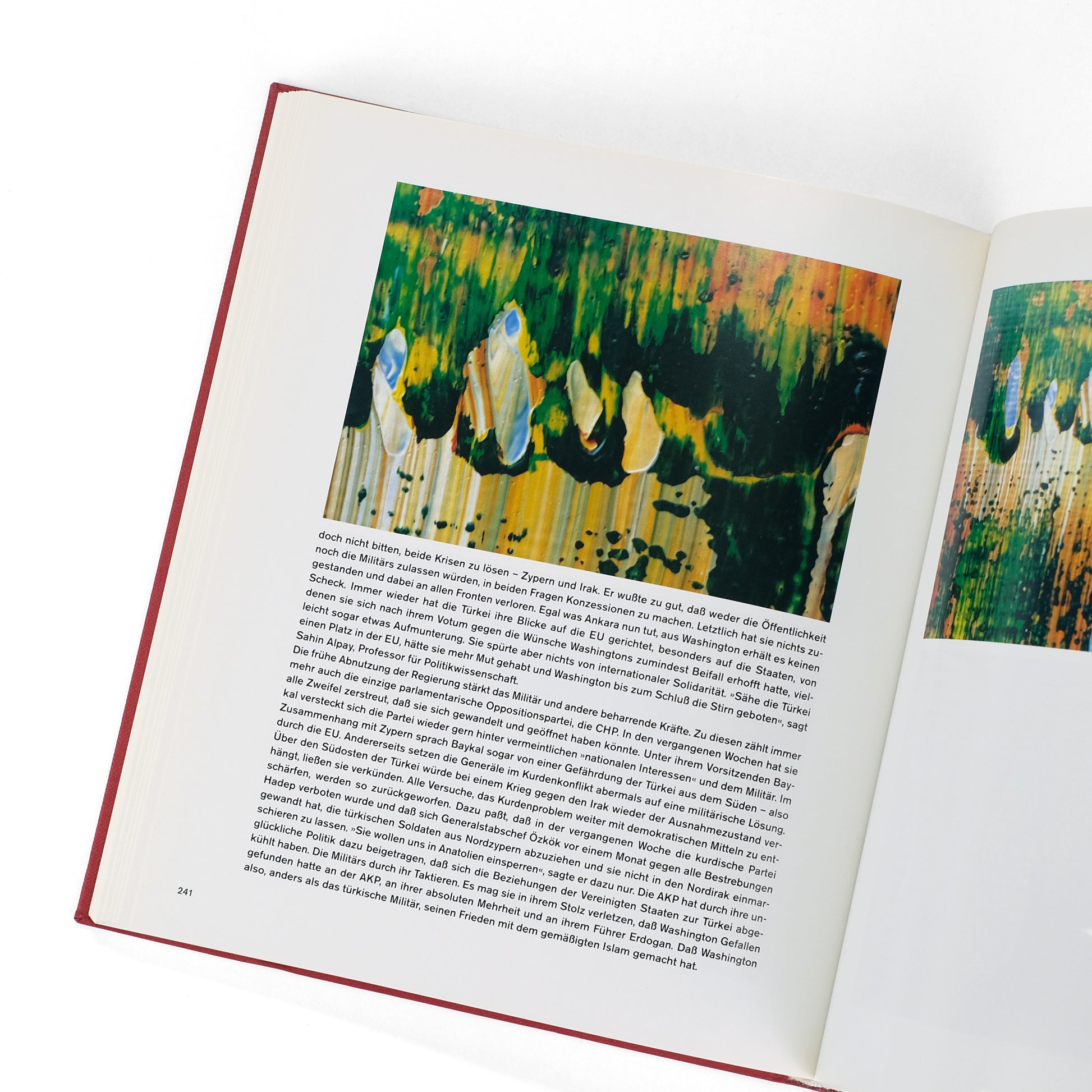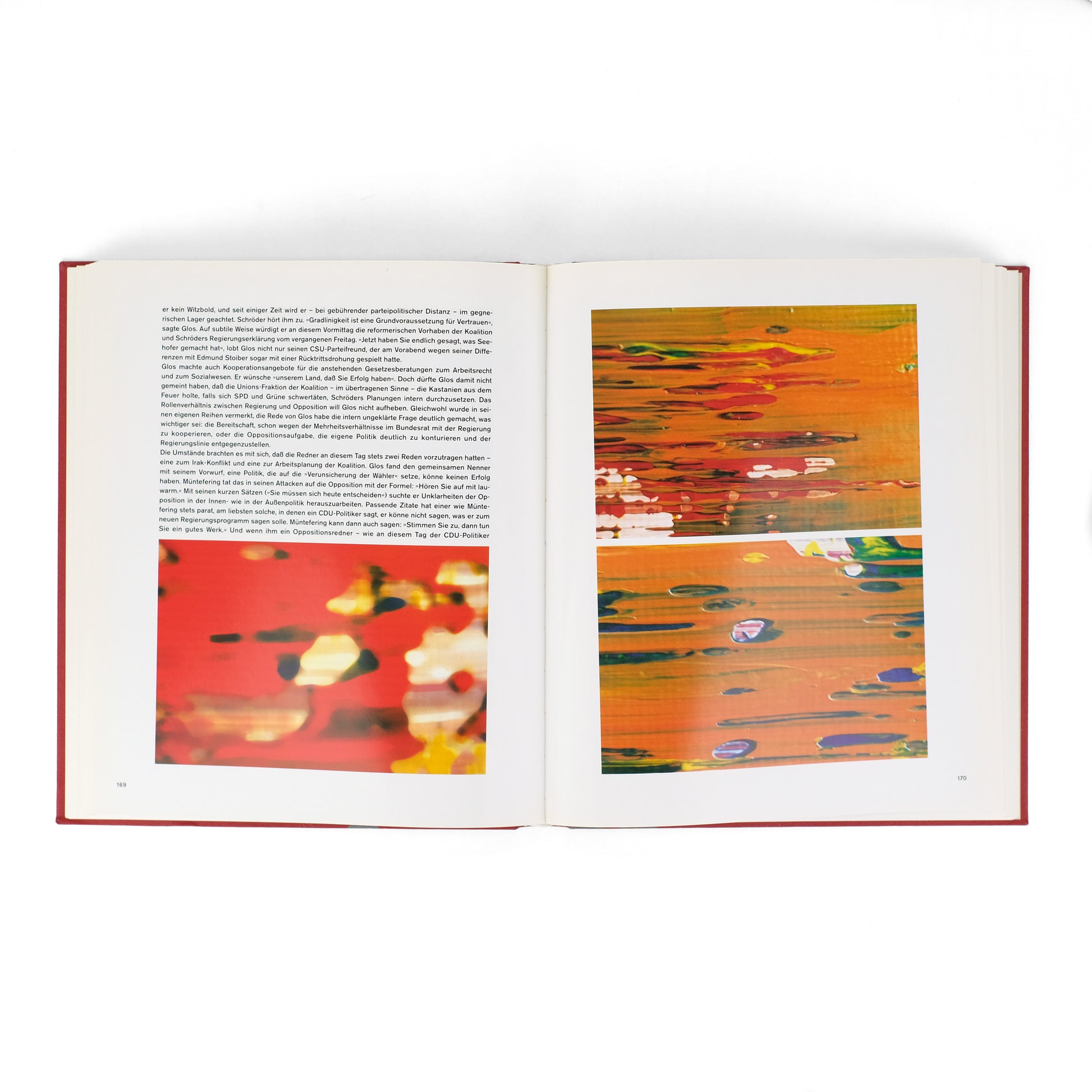 Artist's book by German painter Gerhard Richter (b. 1932), pairing detail photographs from the 1987 oil painting Abstraktes Bild with "155 texts taken from the Frankfurter Allgemeine Zeitung of March 20 and 32, 2003 (beginning of the Iraq War)" (Richter, Editions 1965-2004, No. 124).