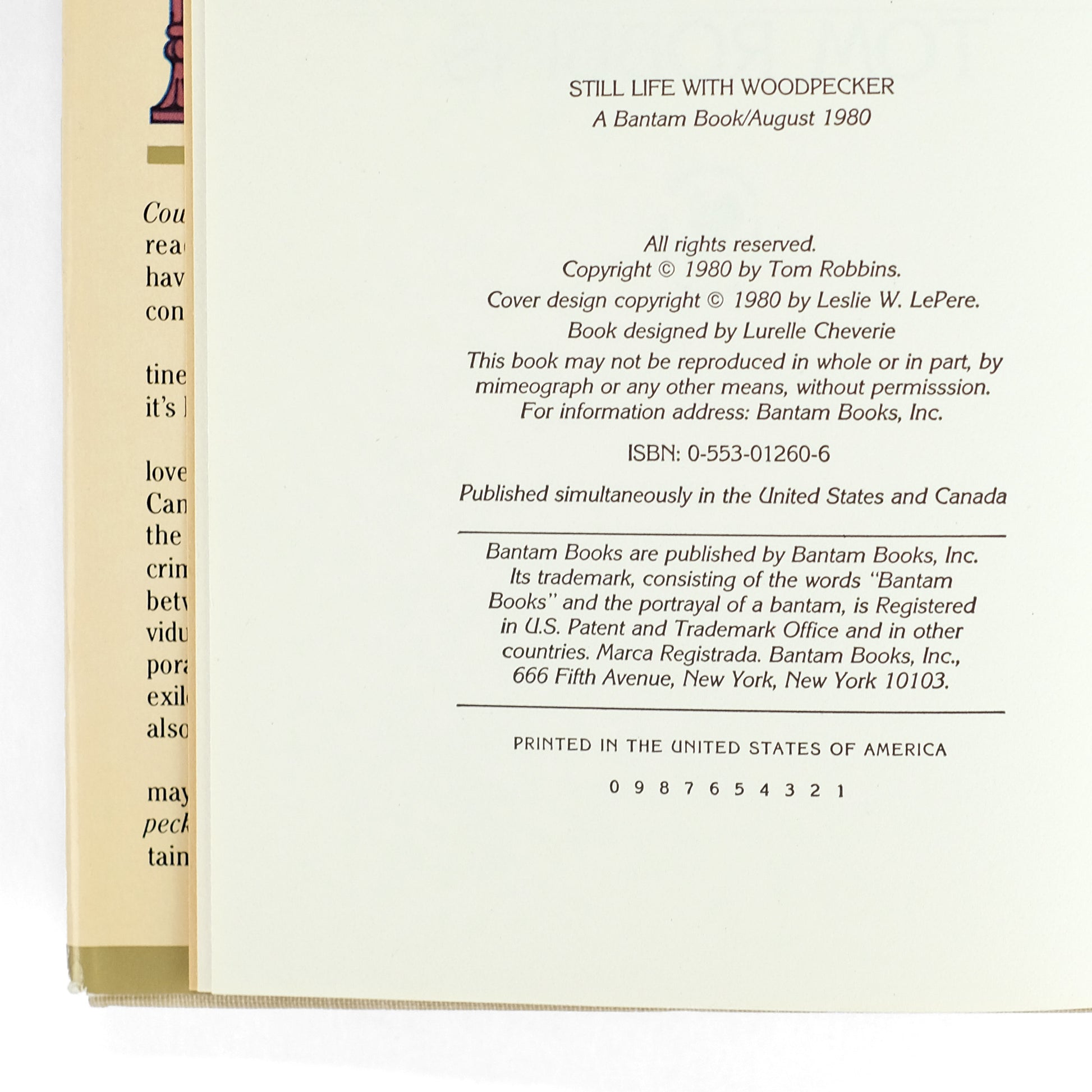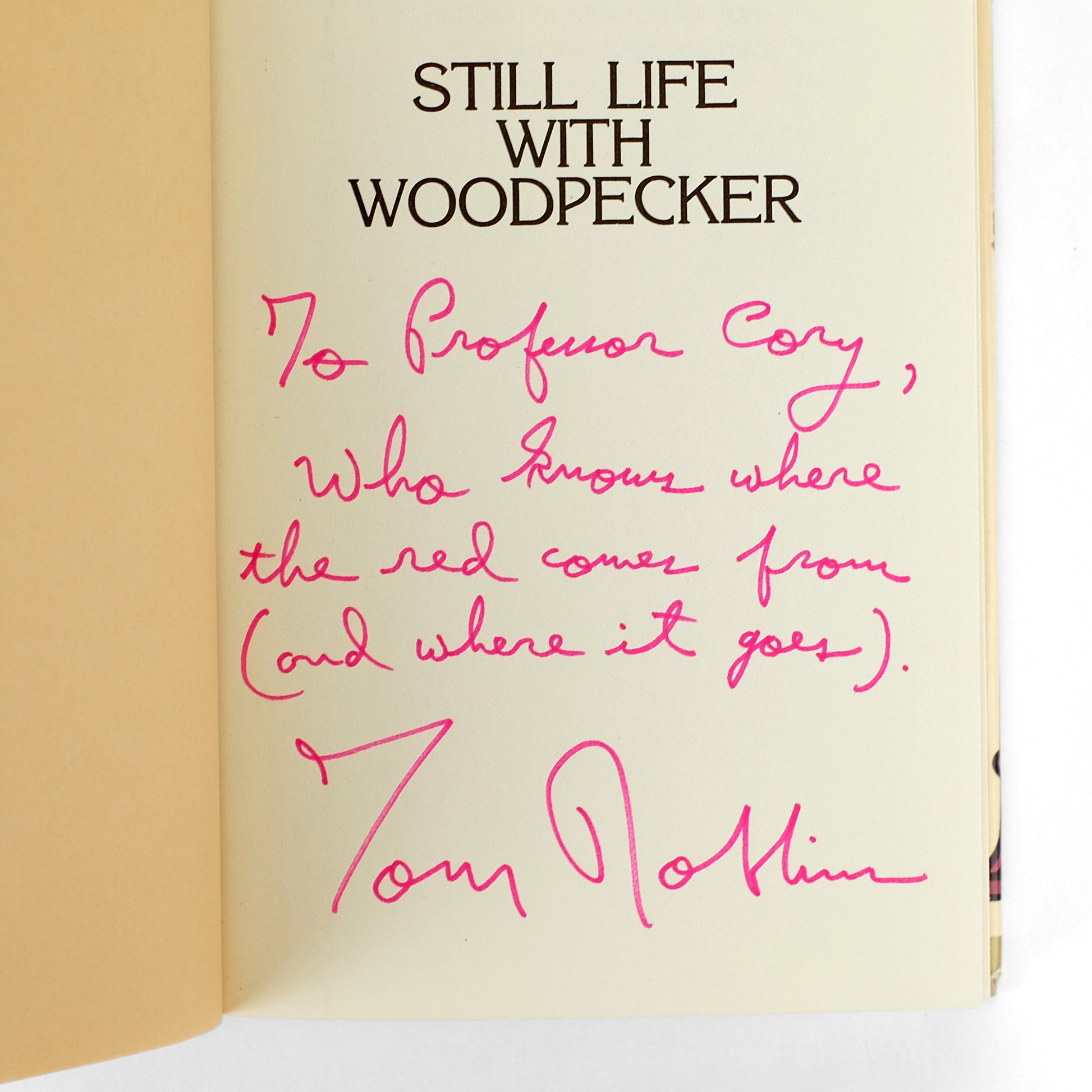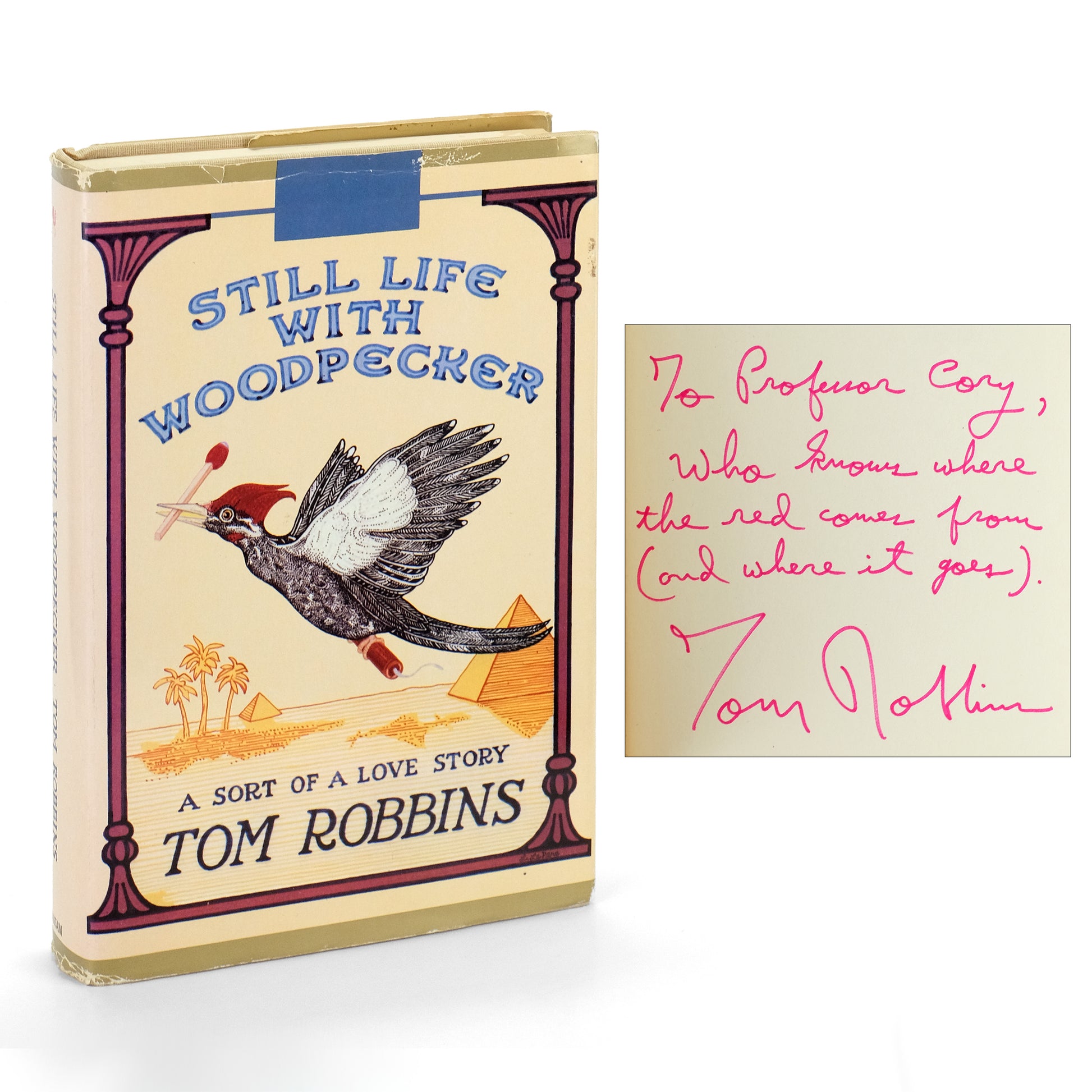 NY: Bantam Books, 1980. First edition (full number line on copyright page). 277pp. Tan cloth; dust jacket. Splash stain to top corner of textblock, penetrating little if at all onto leaves. Else better than very good in an unclipped ("$12.95) jacket with a tiny chip to head of rear panel, light wear at spine ends, and several short closed edge tears. Signed and inscribed by Robbins to half-title: "To Professor Cory, who knows where the red comes from (and where it goes)."