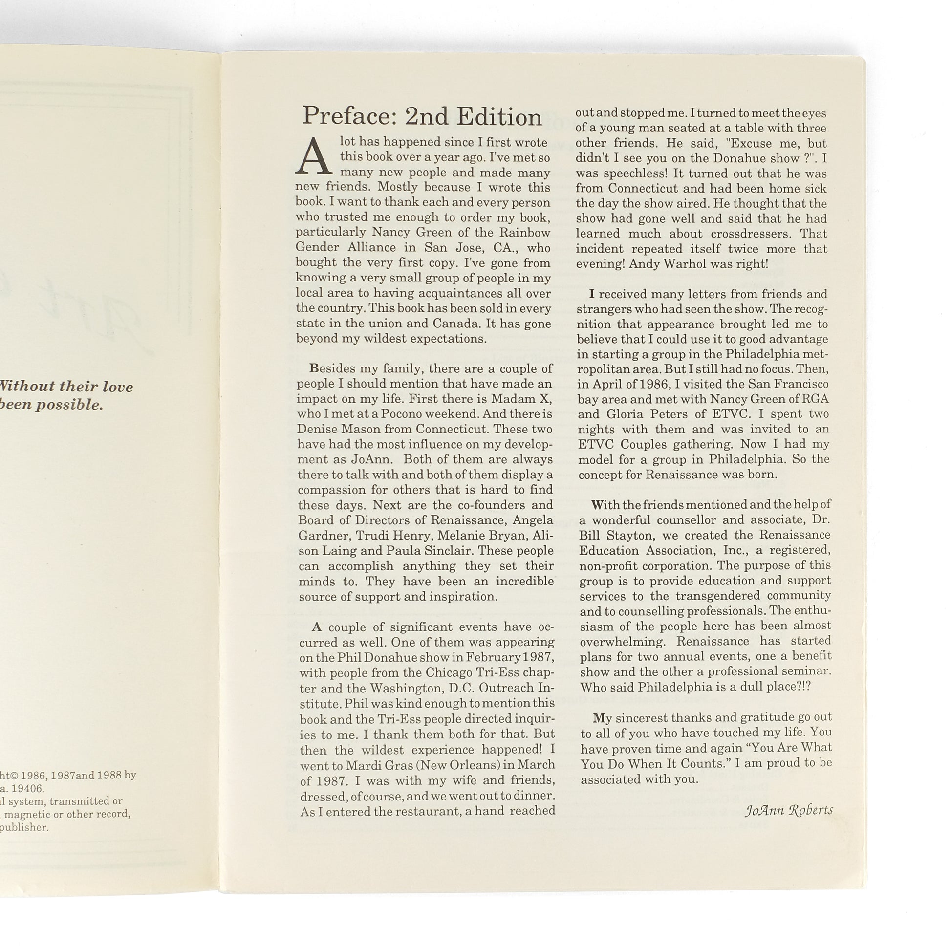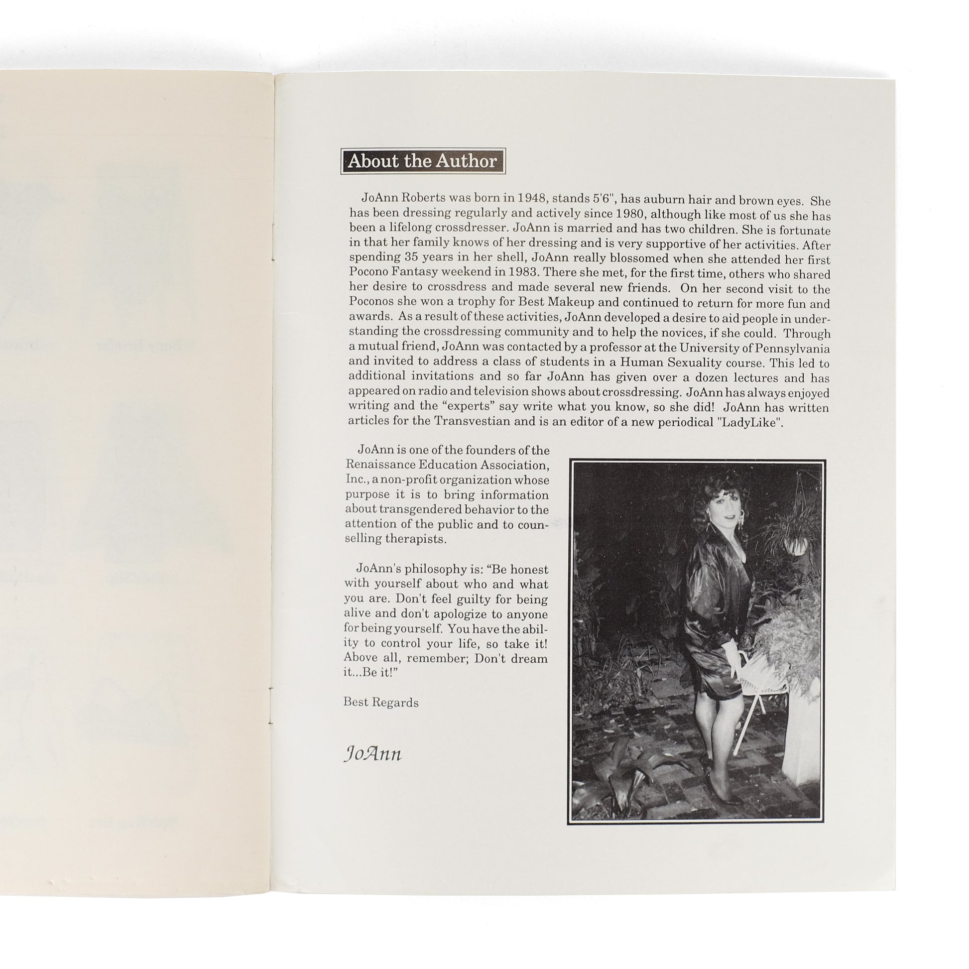 Revised second edition (following the first of 1986) of this practical, illustrated guide to the many aspects of crossdressing, including advice on selecting and applying facial makeup, lingerie, clothes, and accessories. With a two-page list of trans resources at rear, and an appendix with style guides. Roberts (b. 1948) issued several titles in the Art & Illusion series under her Creative Design Services imprint, and was also the publisher and editor of long-running trans periodical Ladylike.