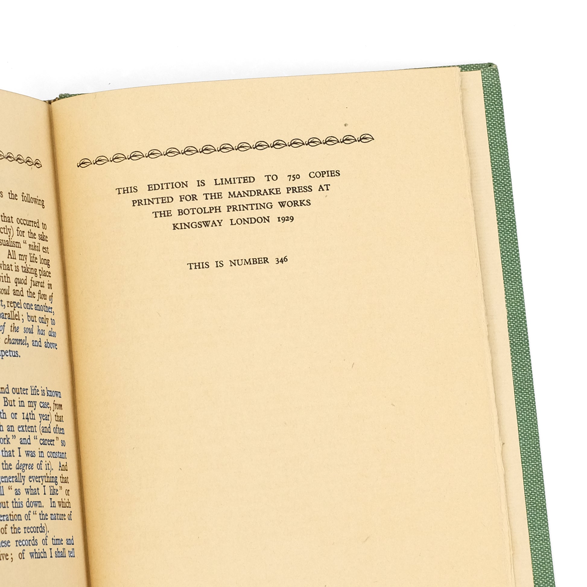 London: The Mandrake Press, 1929. No. 346 of 750 copies. 166pp. Green cloth; lacking a jacket. Leaves toned, else fine.