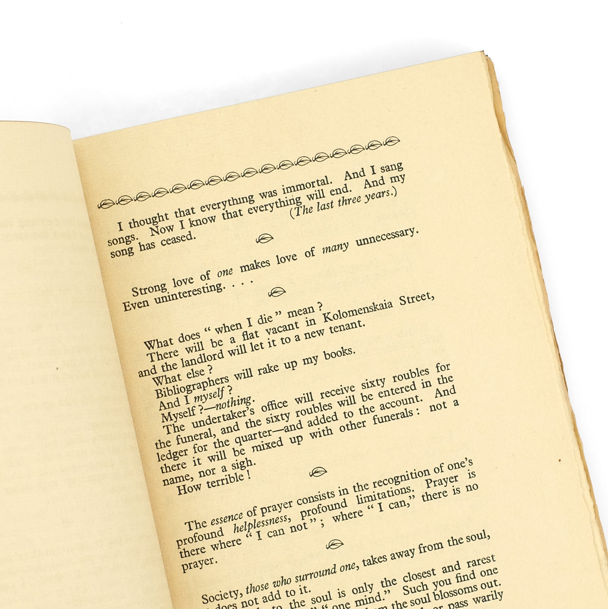 Diaristic aphorisms by the Russian writer and religious philosopher Vasily Rozanov (1856-1919), a controversial figure often associated with the Russian Symbolism movement; though largely suppressed following the revolution, his work continued to exert an influence on later generations of Russian writers, from Gorky to Nabokov. Translated from the Russian by S. S. Koteliansky. With a foreword by James Stephens. A superb copy.