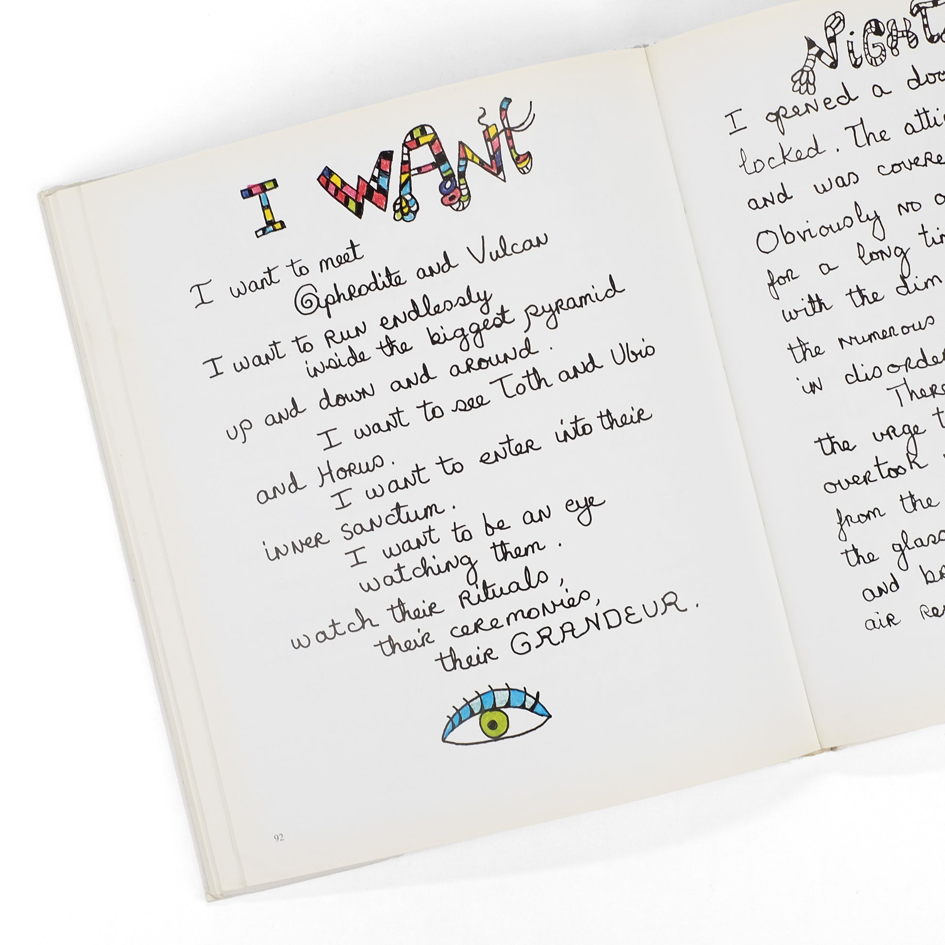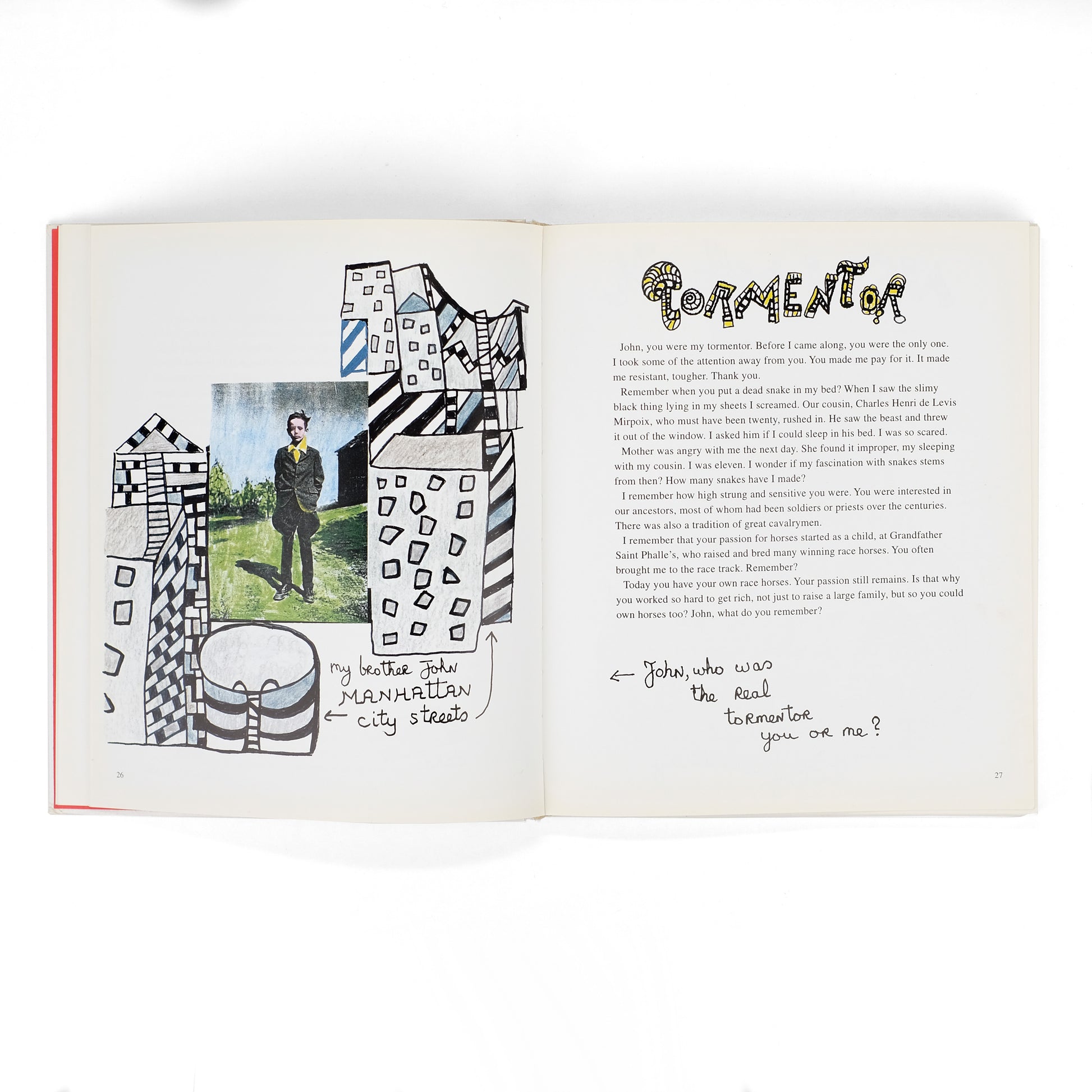Association copy of this autobiographical artist's book by multidisciplinary French artist Niki de Saint Phalle (1930-2002); illustrations and reproduced holograph texts exploring Saint Phalle's formative adolescent years, with much attention paid to her experiences living in New York City, and her relationship with her father. This copy inscribed to artist Emma [Rivers] (b. 1966), whose work shares many aesthetic and thematic affinities with Saint Phalle's. Rivers' series of dollhouse sculptures, Stage-Set, operates in a similar autobiographical vein, depicting childhood memories and unpacking Rivers' relationship with her own father, the late artist Larry Rivers.