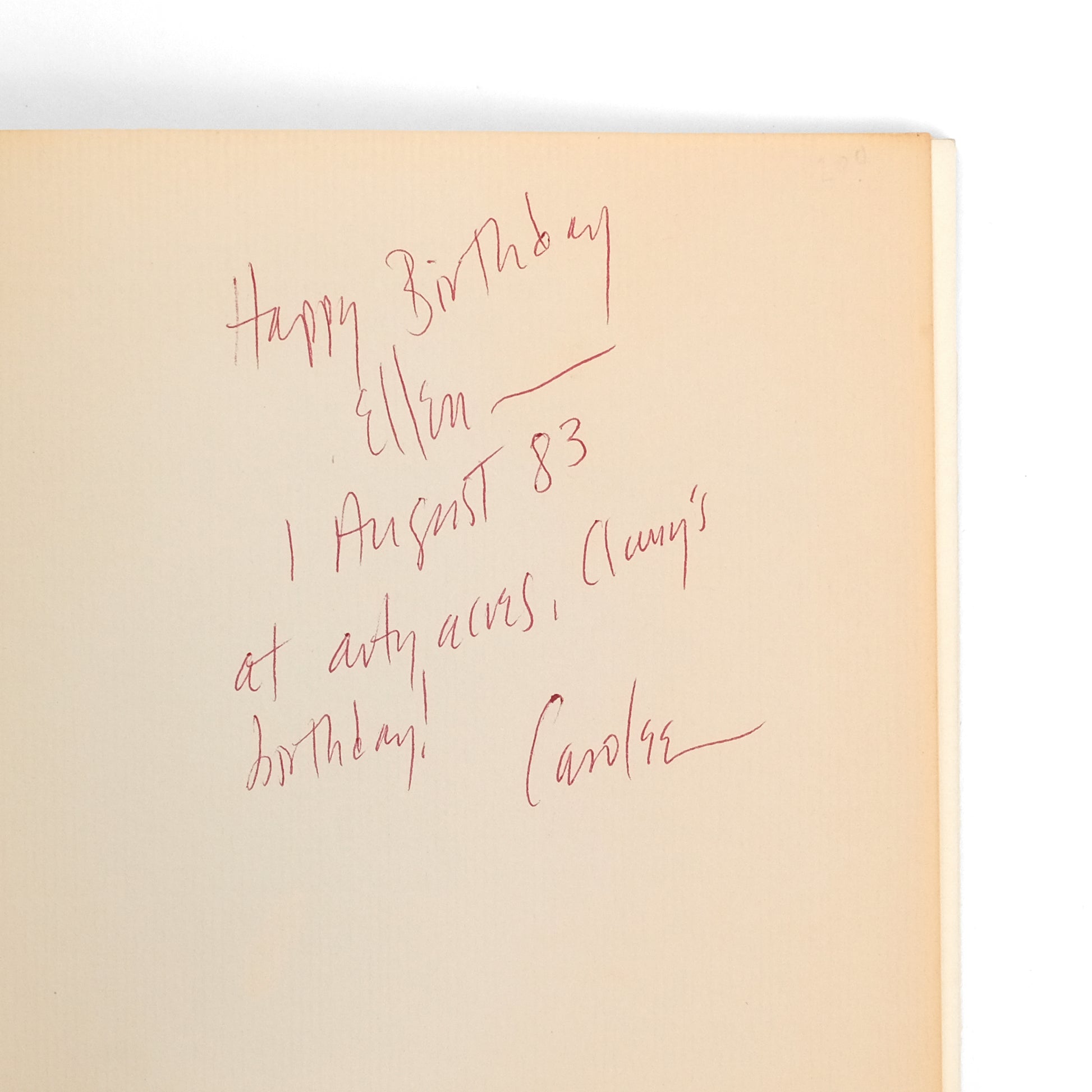 Catalog for an exhibition of thirty early paintings and assemblages by experimental multi-media artist Carolee Schneemann (1939-2019). Introduction by Ted Castle; list of works, chronology, and bibliography at rear. This copy signed and inscribed by Scheemann on front flyleaf, evidently to a close friend: "Happy Birthday Ellen - 1 August 83 at arty acres, Cluny's birthday! Carolee."