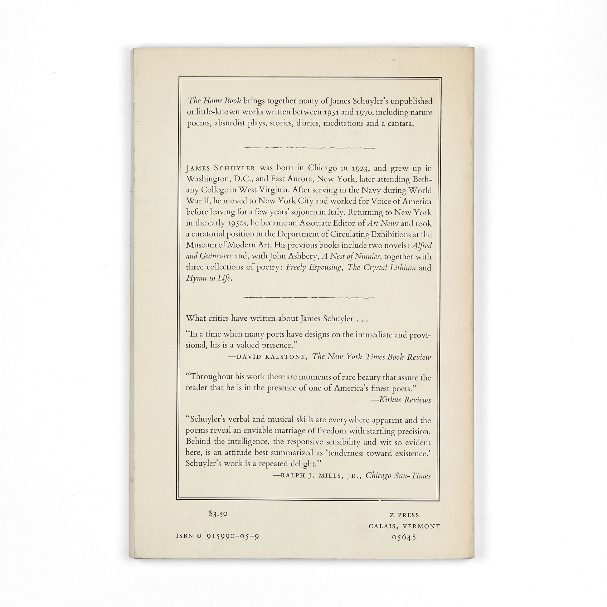 Previously unpublished works by American poet James Schuyler (1923-1991), including "nature poems, absurdist plays, stories, diaries, meditations and a cantata." Edited by Trevor Winkfield, with cover illustration by Darragh Park. Though unstated, this copy from the library of New York School poet, librettist, and Z Press publisher, Kenward Elmslie (1929-2022).