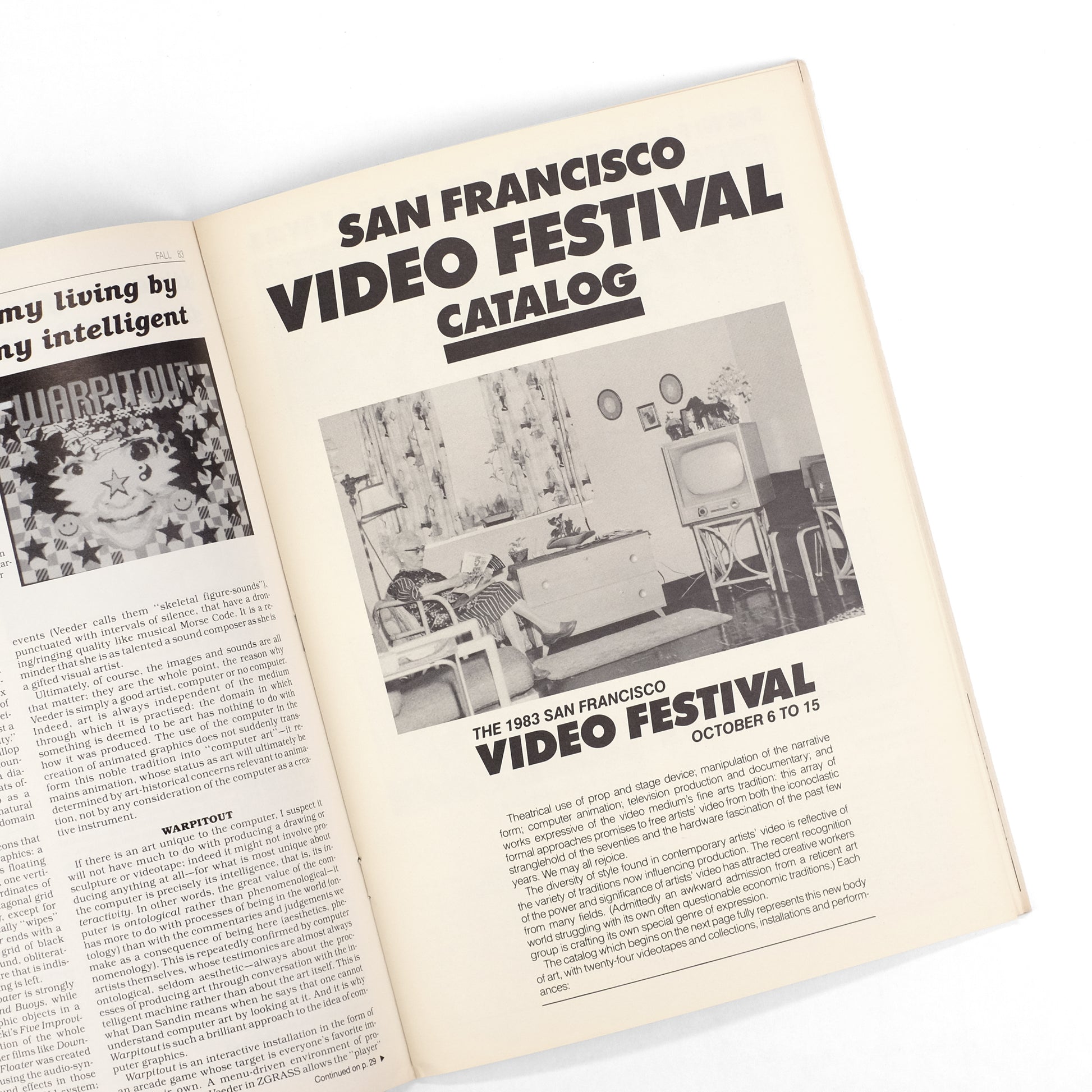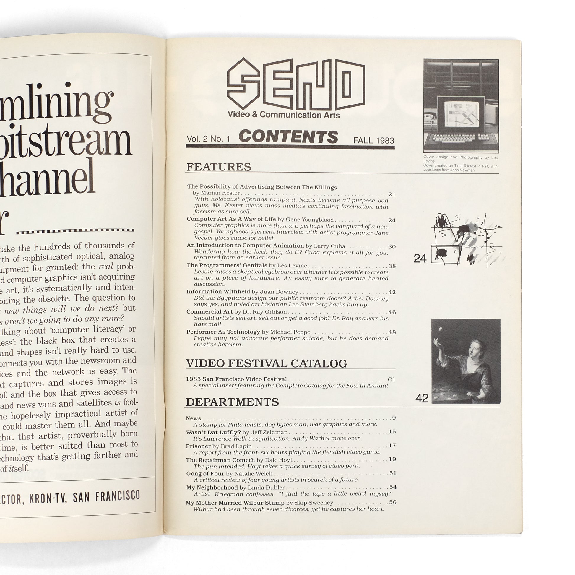 Seventh issue of this periodical exploring the cutting-edge of video technology with regards to both the avant-arts and popular culture. This issue on the theme of "Computer Arts," with features including an article by Marian Kester on "mass media's continuing fascination with fascism"; "Computer Art As A Way of Life" by Gene Youngblood; "An Introduction to Computer Animation" by Larry Cuba; "The Programmers' Genitals" by Les Levine; "Information Withheld" by Juan Downey; "Commercial Art" by Ray Orbison; and "Performer As Technology" by Michal Peppe. Also a bound-in catalog insert for the 1983 San Francisco Video Festival, and columns by Jeff Zeldman, Brad Lapin, Dale Hoyt, Natalie Welch, Linda Dubler, and Skip Sweeney.