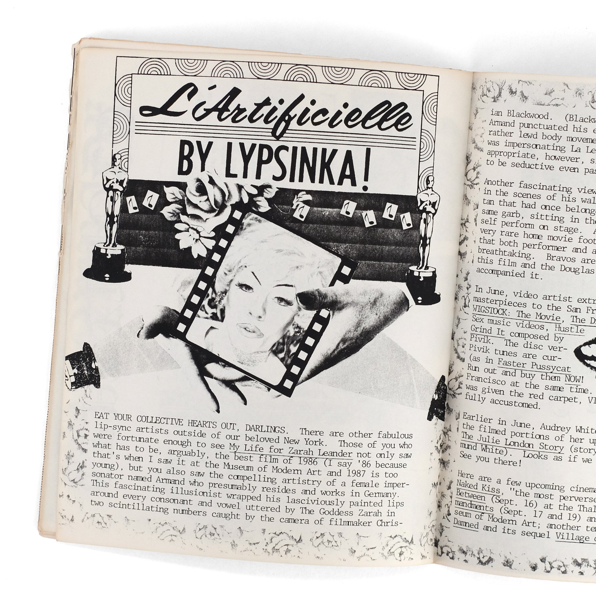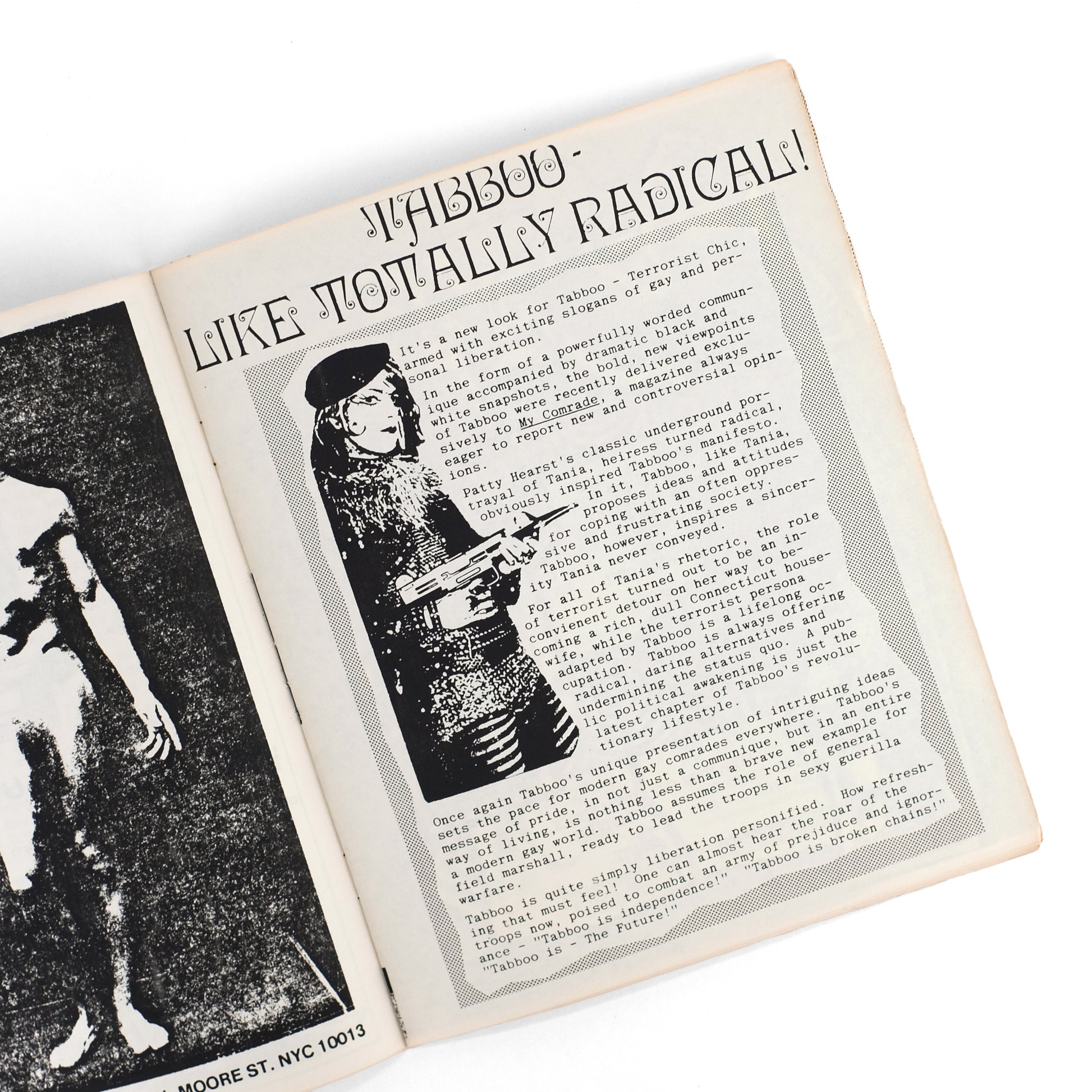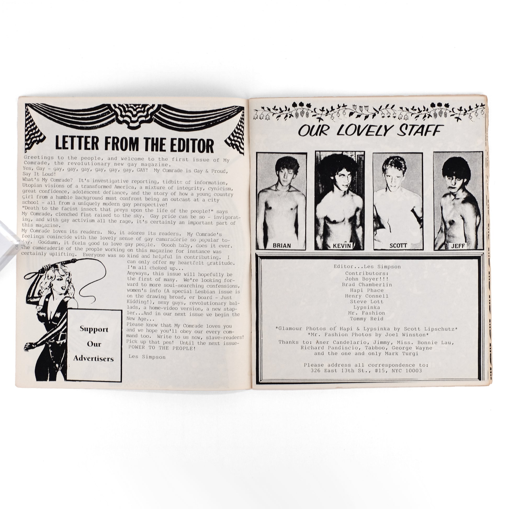 First issue of this queer zine edited by New York drag impresario Linda Simpson; a campily anarchic celebration of queer culture at the peak of the AIDS Epidemic, as well as a time capsule of the fertile drag and gay arts scene centered around the legendary Pyramid Club. Contents include an arts roundup column by Lypsinka ("L'Artificielle"), also featured in the "Backstage with Lypsinka!" photo-profile; an interview with George Wayne, founder of arts and fashion zine R.O.M.E. (a key influence on My Comrade!); a photo series featuring drag performer Tabboo! dressed as Patty Hearst (also pictured on cover); a Spanish-language photo-comic featuring Aner Candelario and Tabboo!; the "My Comrade Centerfold" (Terrorist Hunk); etc. Heavily illustrated throughout with black-and-white illustrations, photographs, and photo-collages, along with numerous illustrated ads for local businesses. A decidedly scarce issue of an important and delightful publication. Bronson & Aarons, Queer Zines v1, pp. 162-163.
