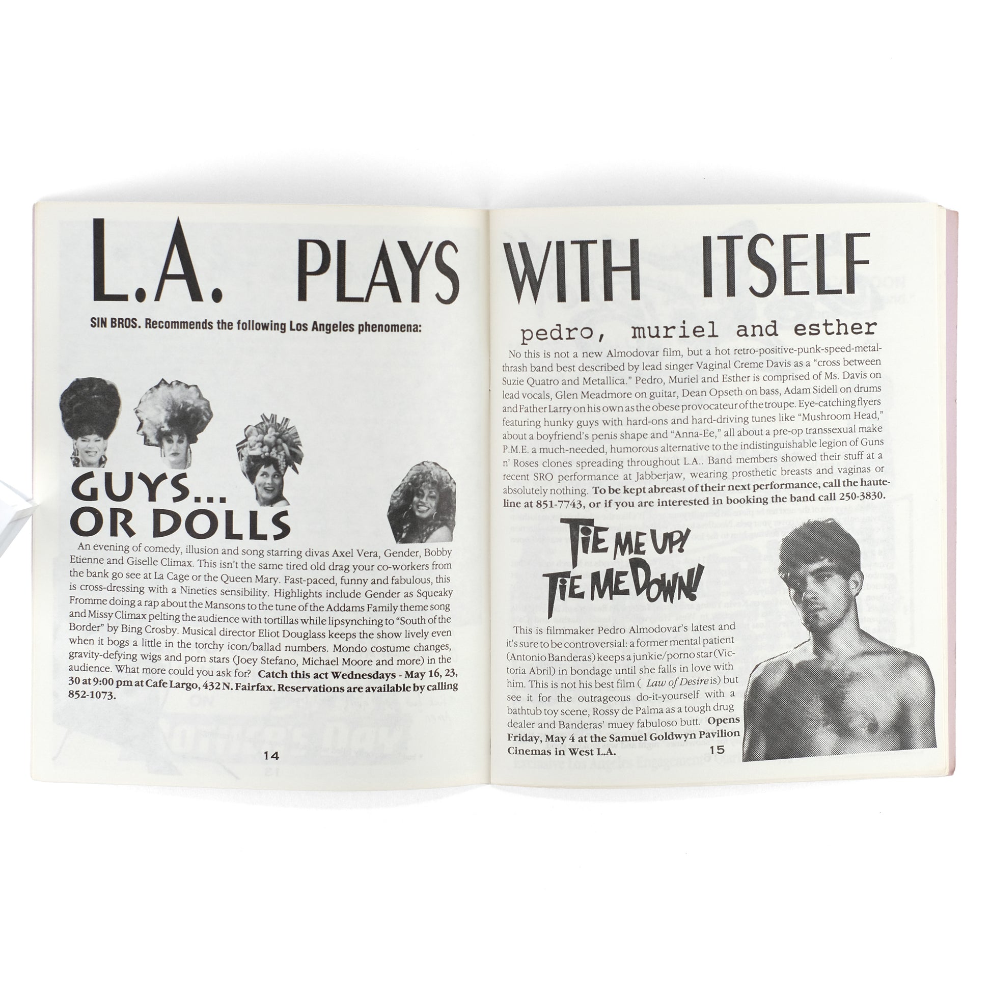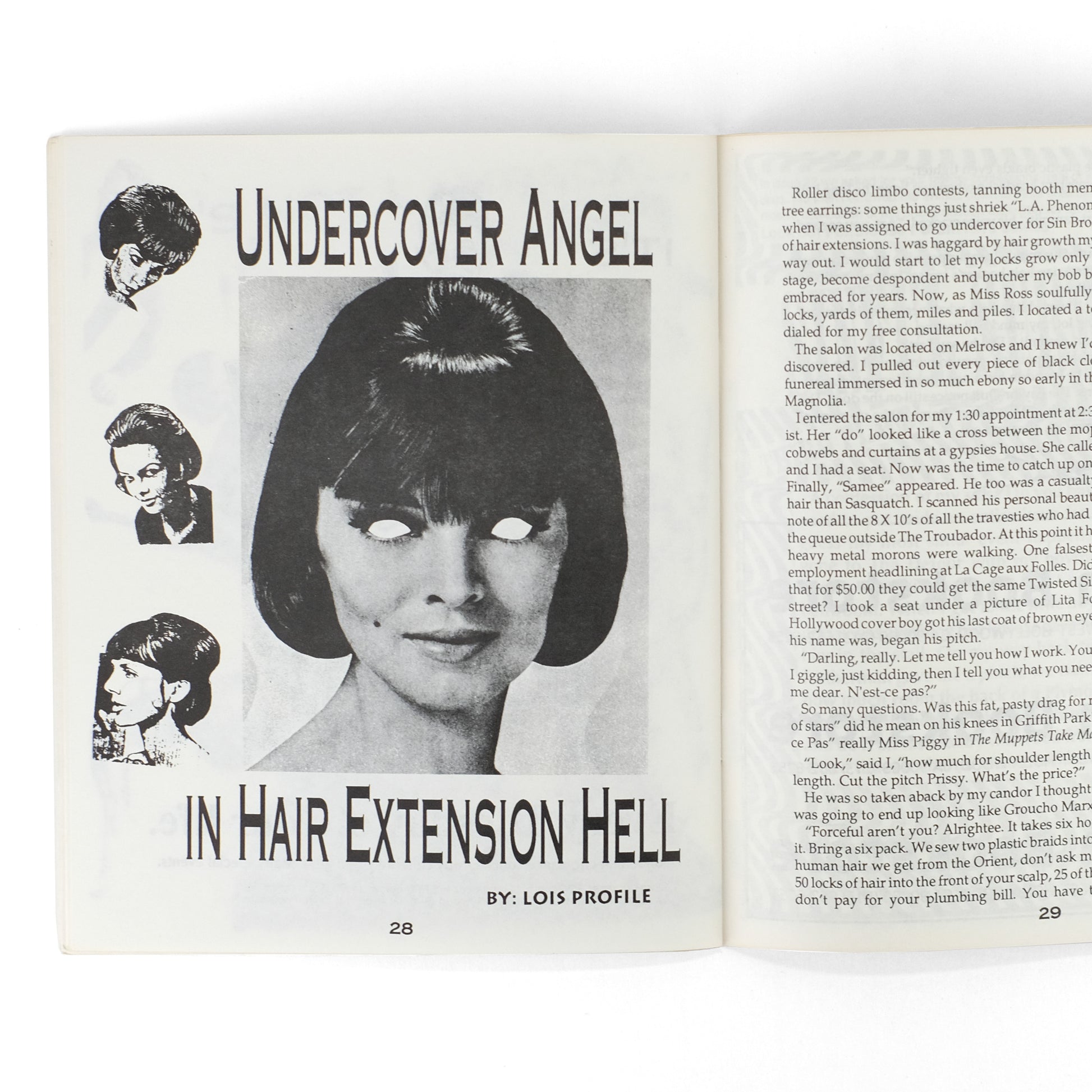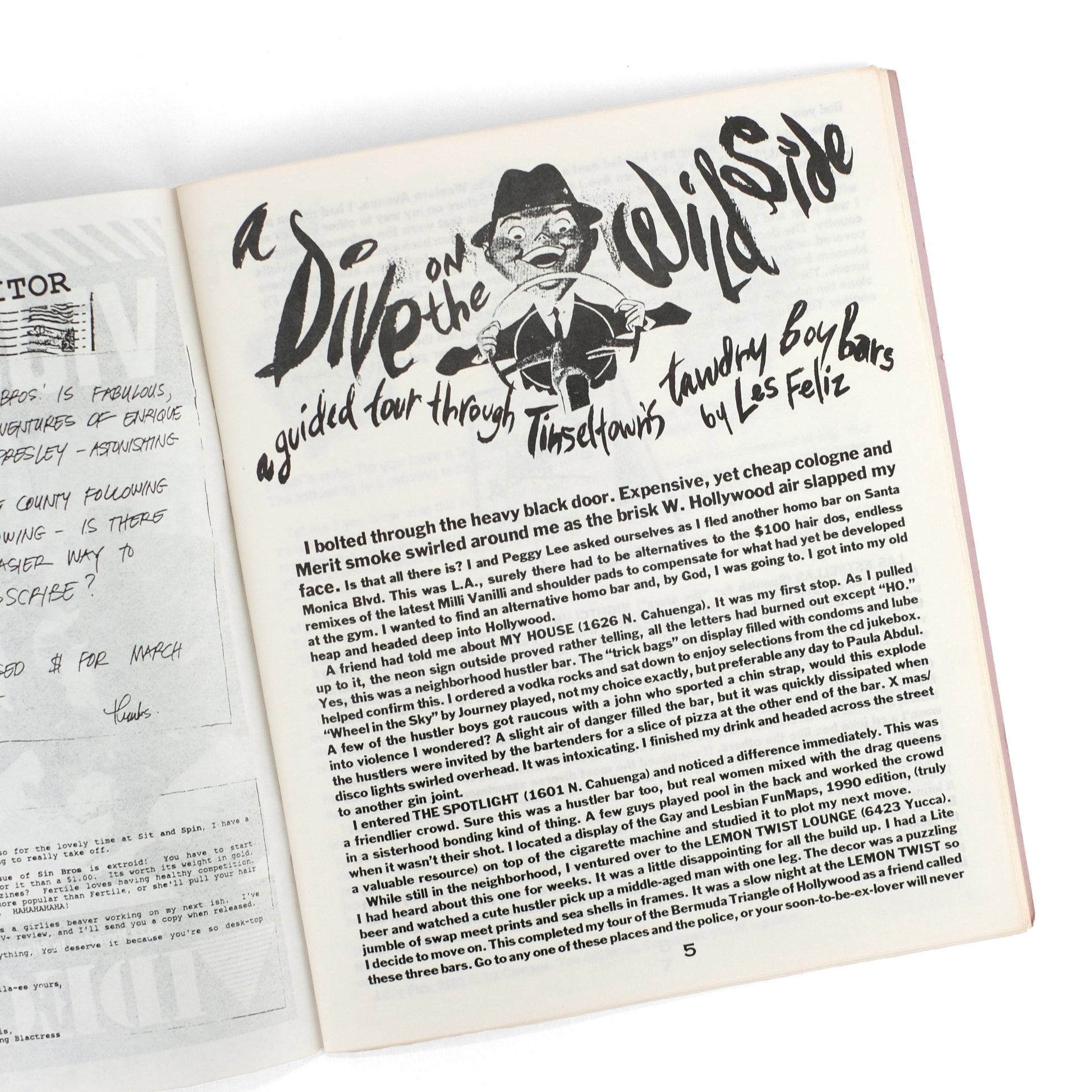 Fourth issue (of six total) of this zine treating various aspects of the Los Angeles queer scene. Contents include: "A Dive on the Wild Side: A Guided Tour Through Tinseltown's Tawdry Boy Bars," by Les Feliz; "Porn. Tips" by Velveeta Fondue; "Sylvia-Screen's Hollywood Babble-On"; "Joy Boys: A Running Commentary on the Male Sex Industry," by Dirk Festive; "MY Life as a Celebutante" by Enrique Marie Presley; "Undercover Angel in Hair Extensions" by Lois Profile; letters; columns; ads; etc. With black-and-white illustrations, photographs, and photo-collages throughout. OCLC locates seven institutional holdings of this title. Bronson & Aarons, Queer Zines v1, p. 209.