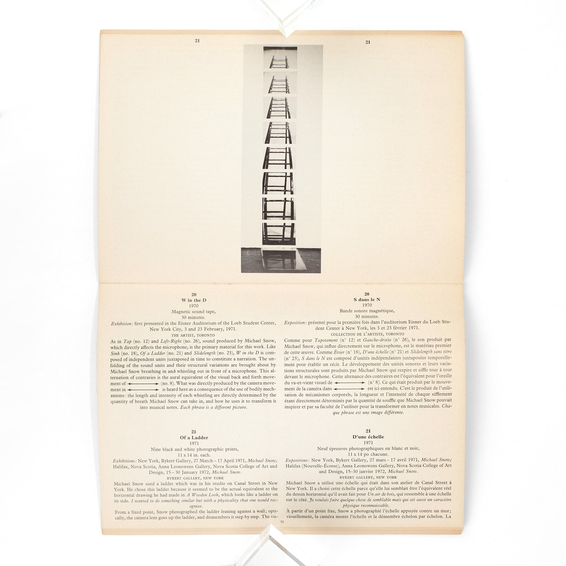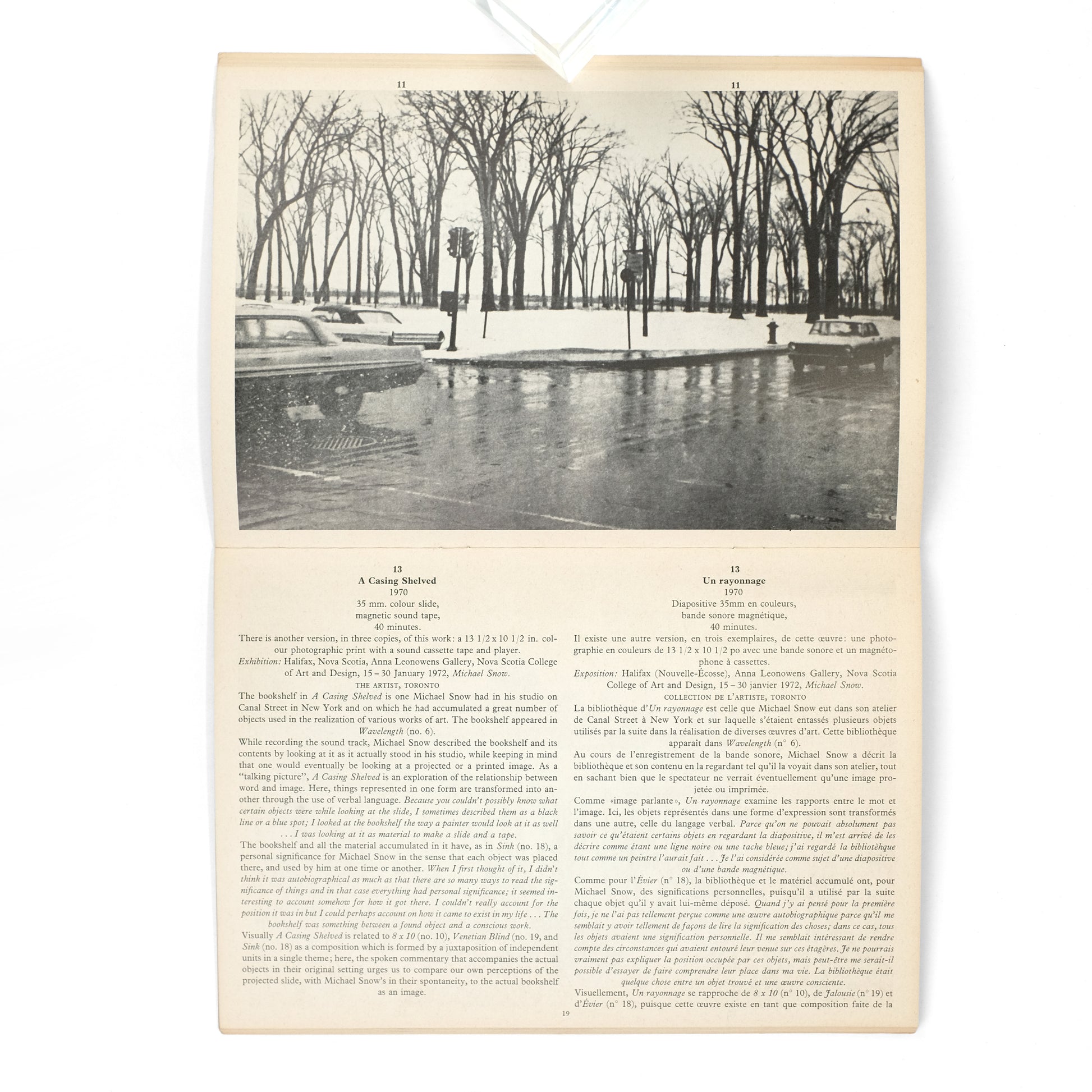 Catalog published in conjunction with an exhibition of works by Canadian artist Michael Snow (1929-2023), at the Center for Inter-American Relations in New York, 15 November-31 December 1972. Detailed descriptions and notes on thirty works, with accompanying photographs. With a foreword by Jean Sutherland Boggs, a text by filmmaker Jonas Mekas ("A Note on Michael Snow, written in a Minnesota snowstorm"), and lists at rear of reviews, books, and exhibitions. All text in English and French.