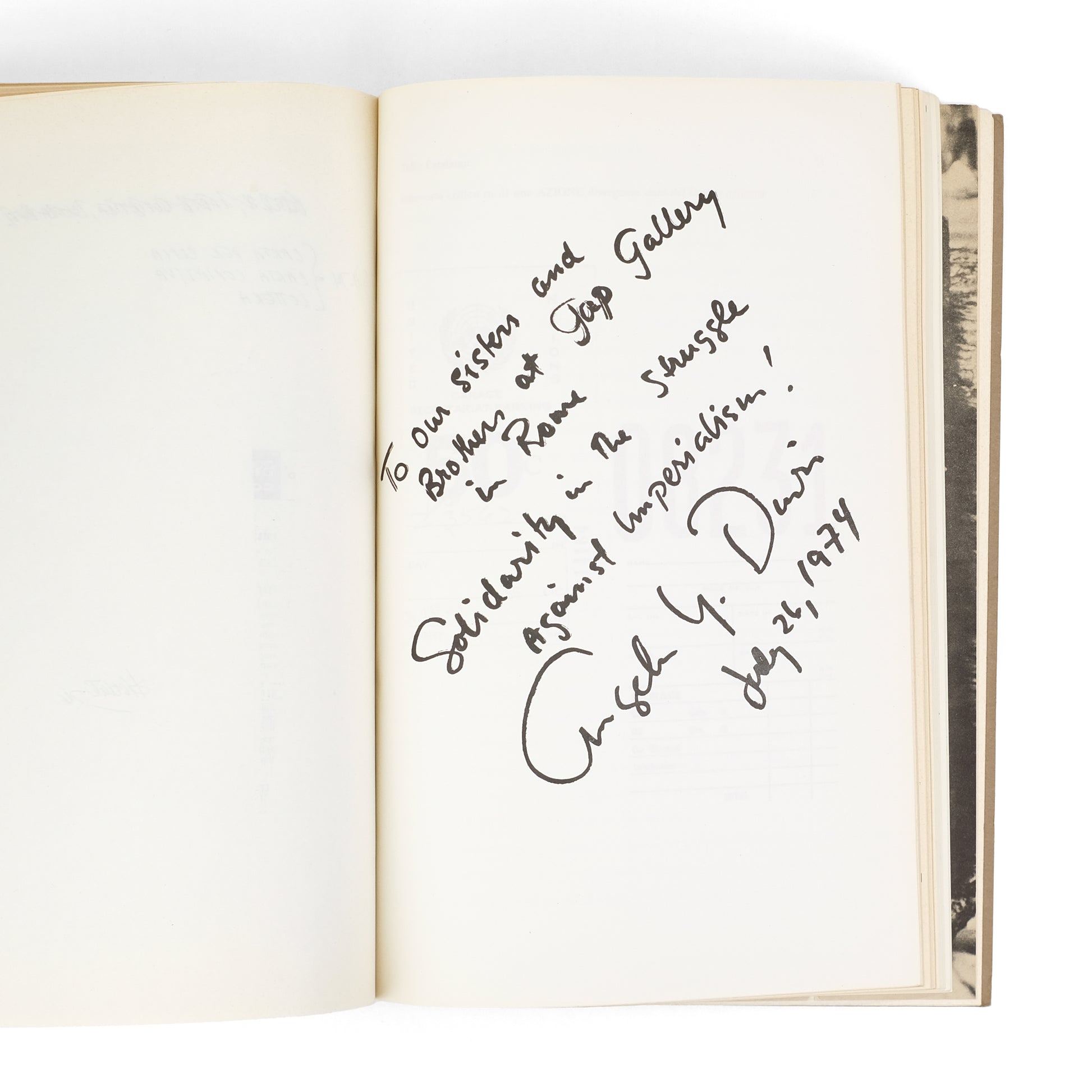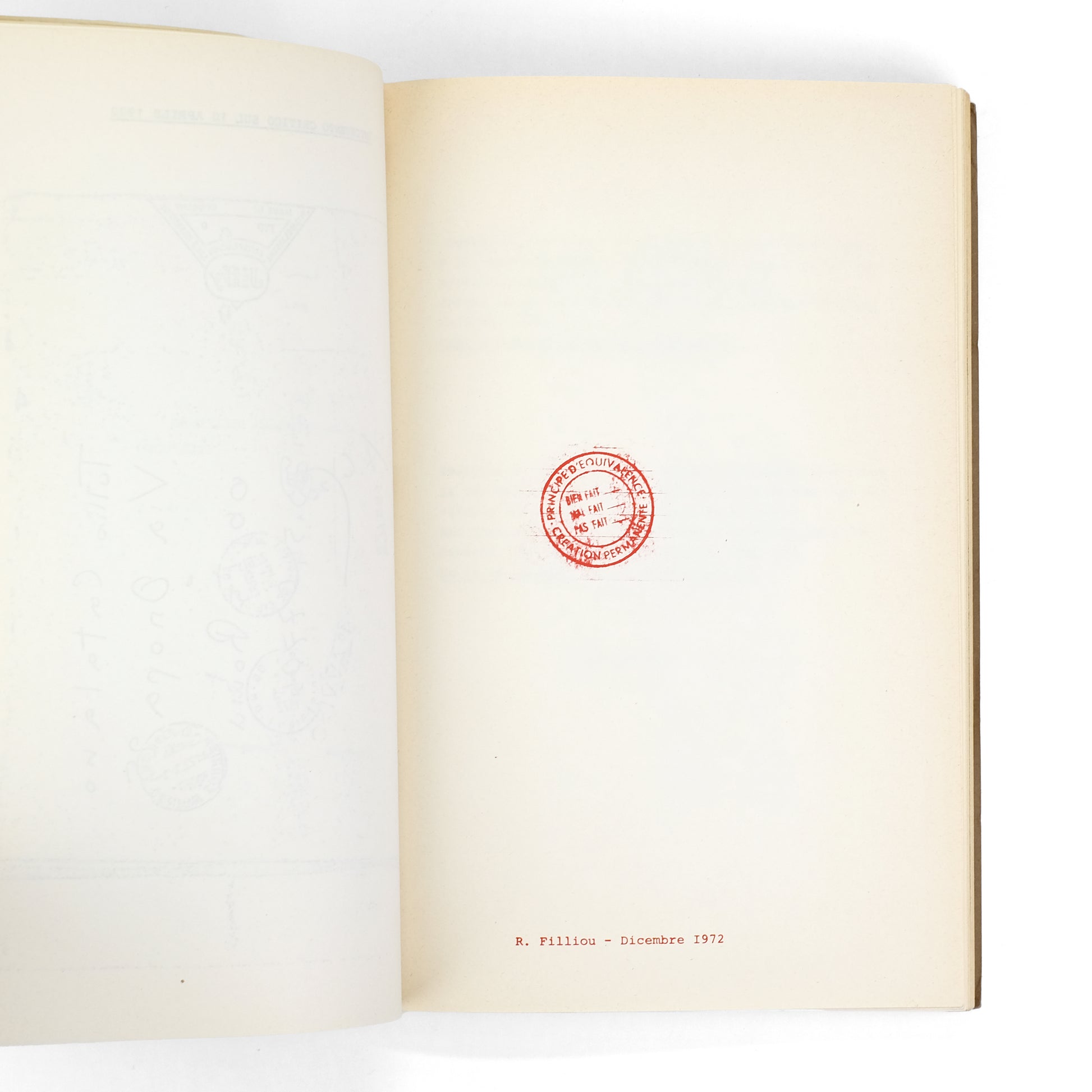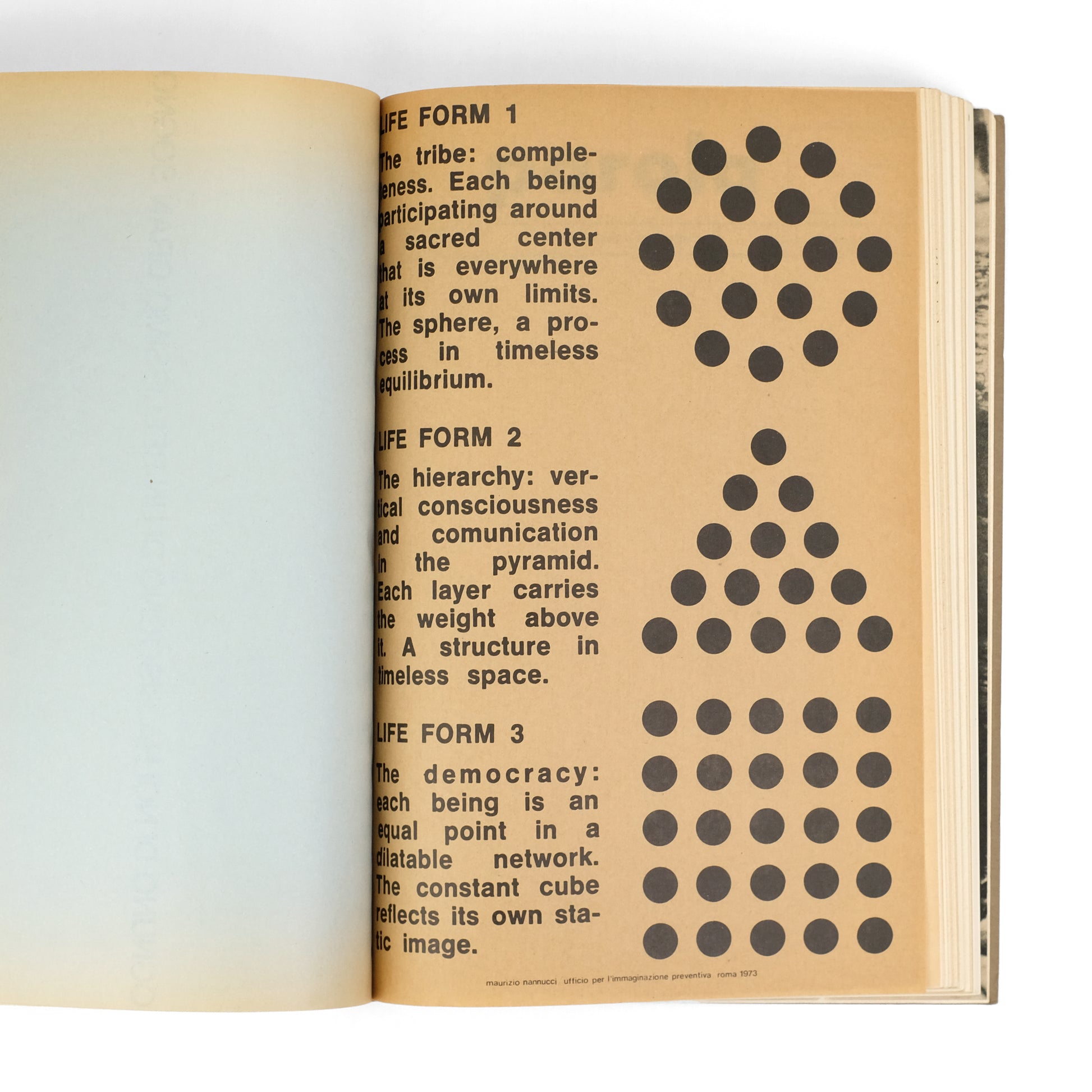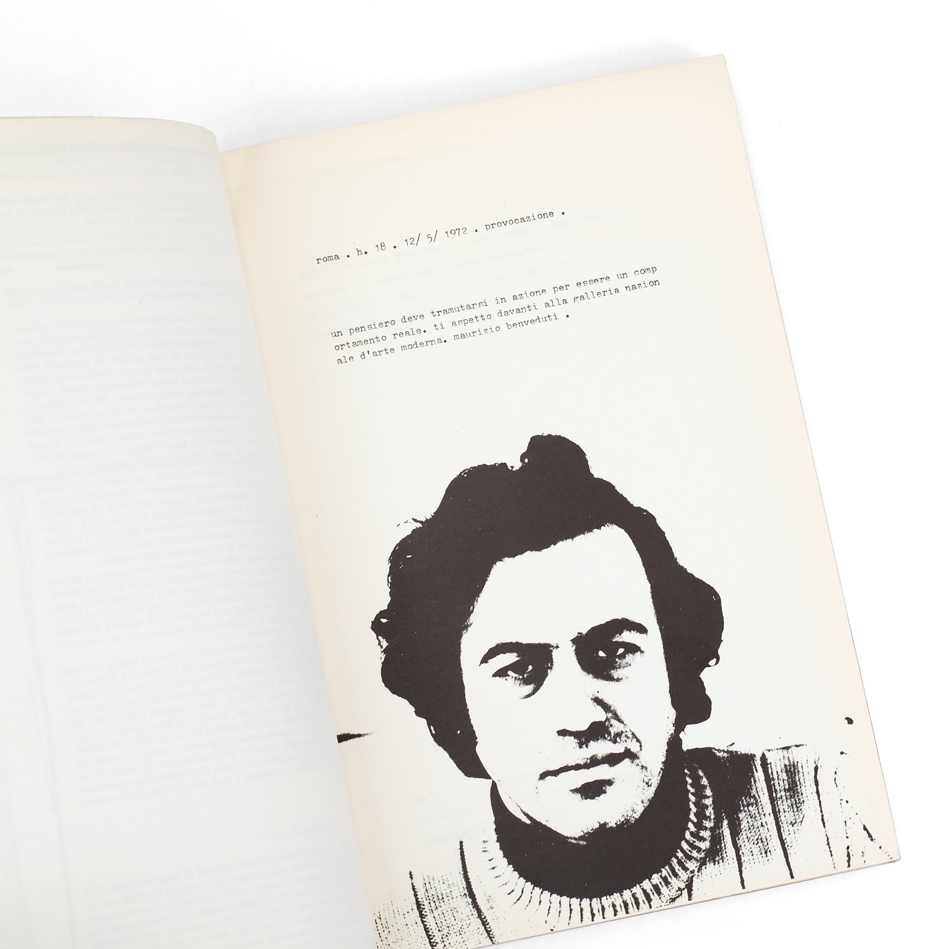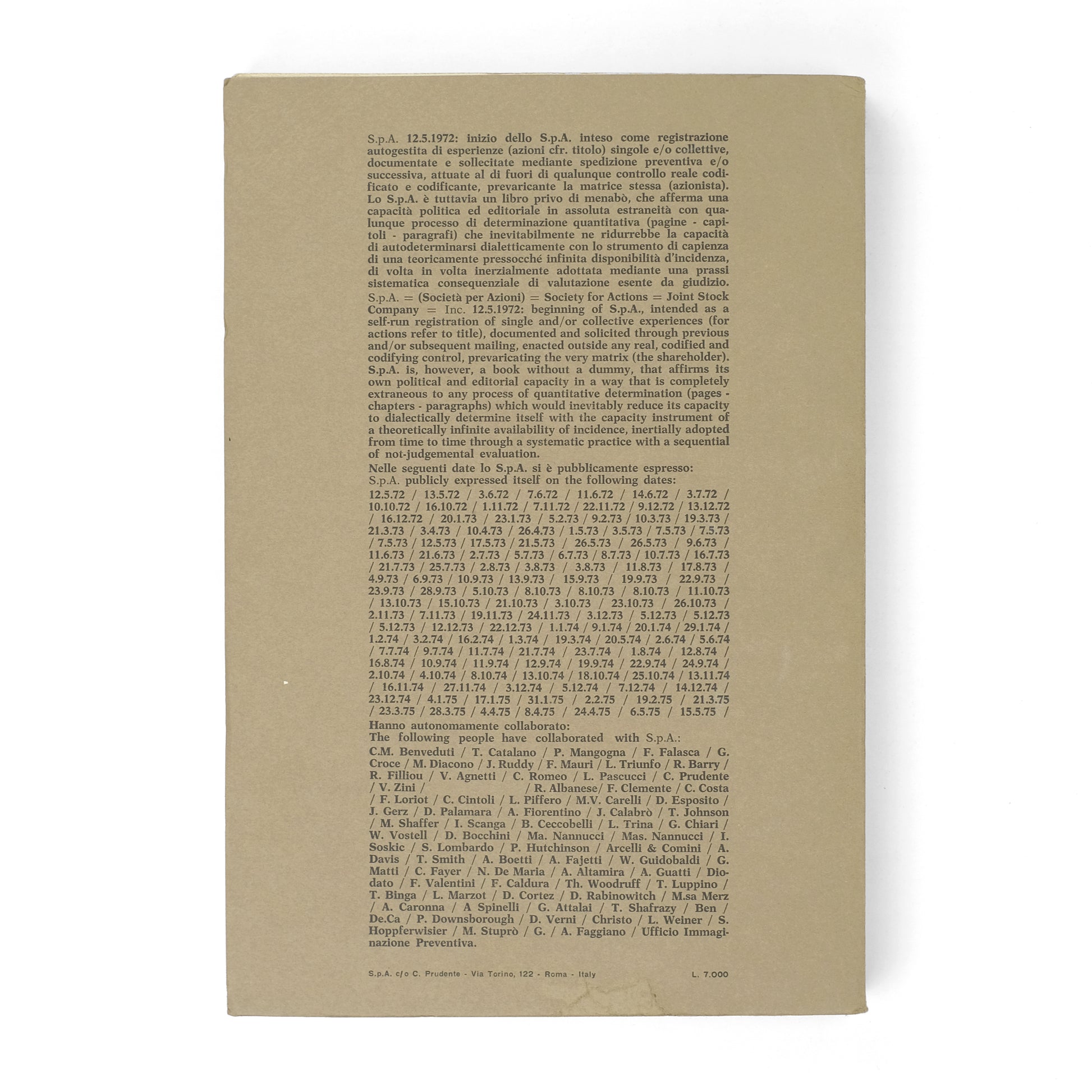 An Assembling-style collaborative Italian artists' book operating in a radical, non-hierarchical spirit, and featuring sheets provided by 78 international artists. Organized by Carlo Maurizio Benveduti and Tullio Catalano, the project requested that each co-author produce 1,000 copies of their sheets, half of which they were responsible for disseminating themselves in various ways; the other half being collected into the present edition. Contents include conceptual texts, collages, visual poetry, photographs, drawings, performance documentation, etc., reproduced on various paperstocks and by various means, principally in black-and-white. Contributors, associated with Art Povera, conceptual art, Fluxus and other movements, include Robert Filliou, Wolf Vostell, Ben Vautier, Christo, Lawrence Weiner, Vincenzo Agnetti, Fabio Mauri, Marisa Merz, David Rabinowich, Giuseppe Chiari, Robert Barry, Maurizio and Massimo Nannucci, Sergio Lombardo, Peter Downsbrough, Jochen Gerz, Tomaso Binga, Angela Davis, et al. Texts in various languages, principally Italian and English. With a brief and somewhat convoluted description of the project to rear cover (Italian and English), along with a list of contributors.