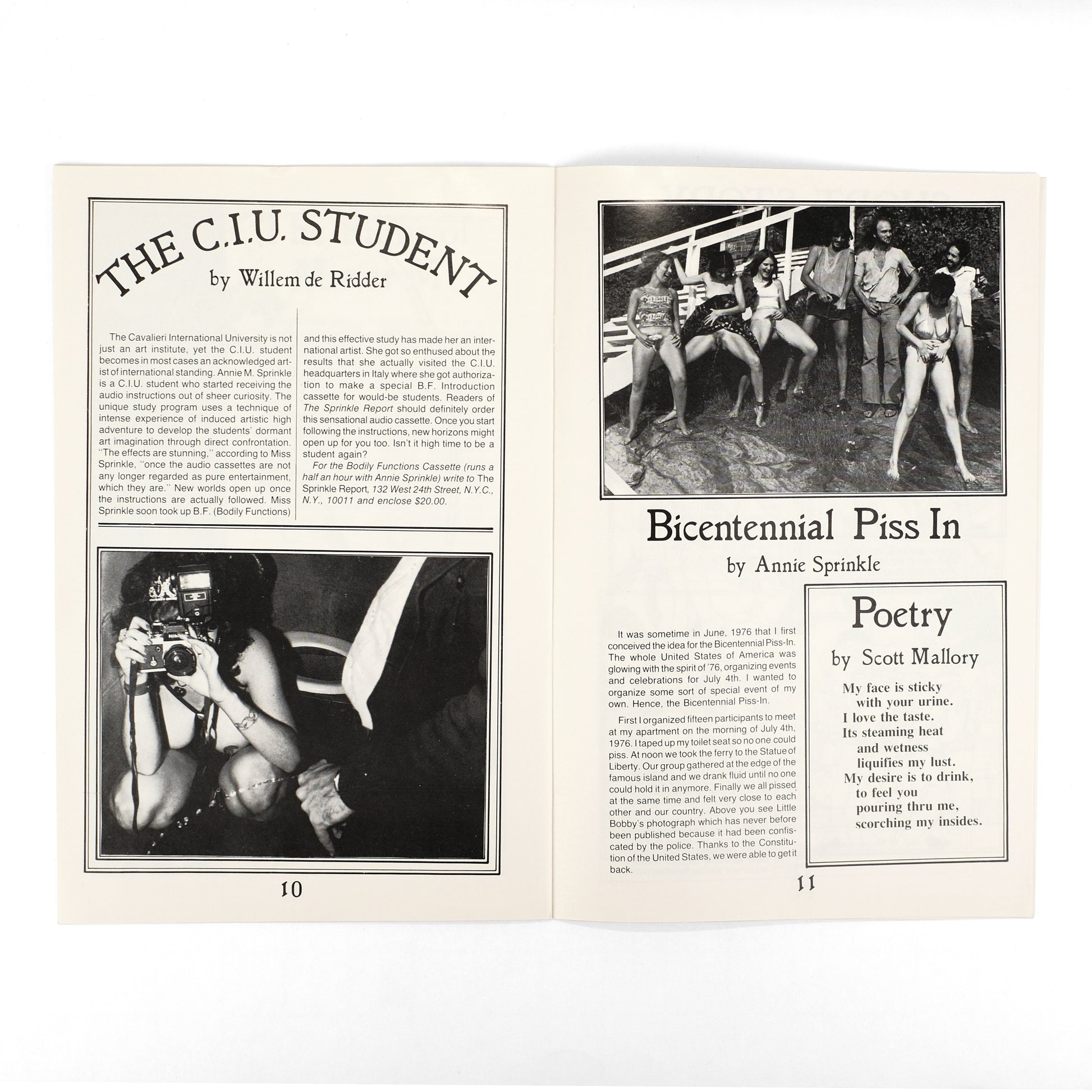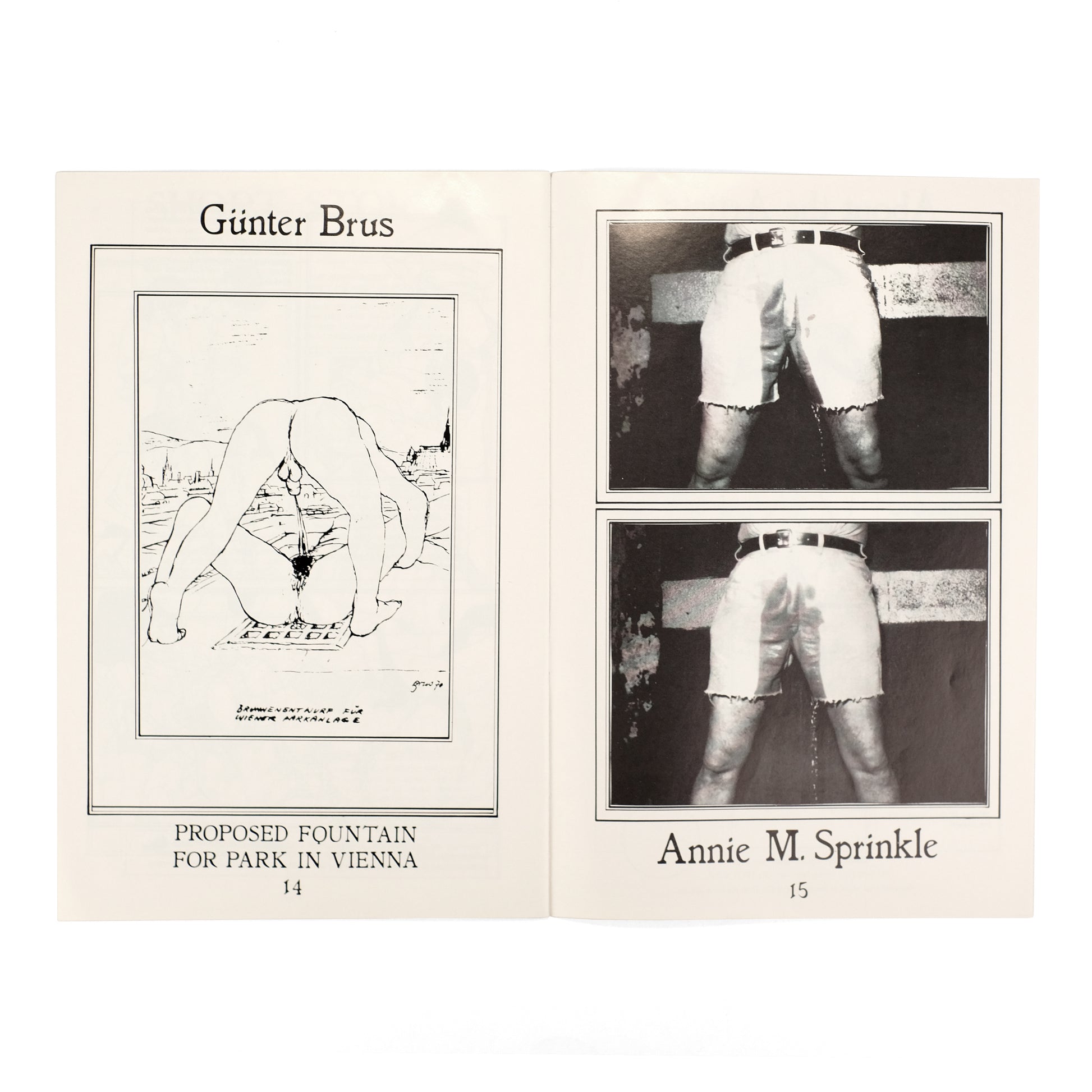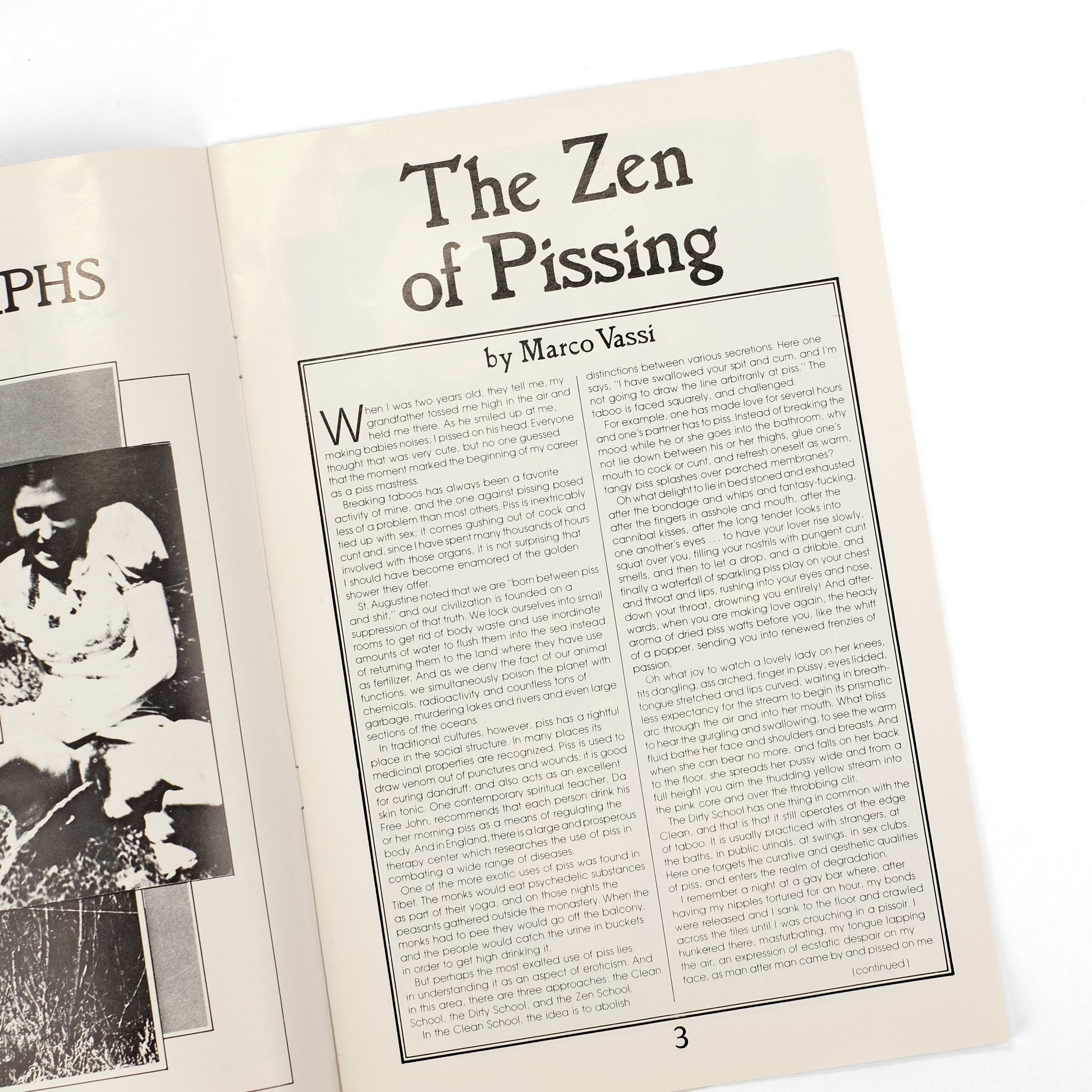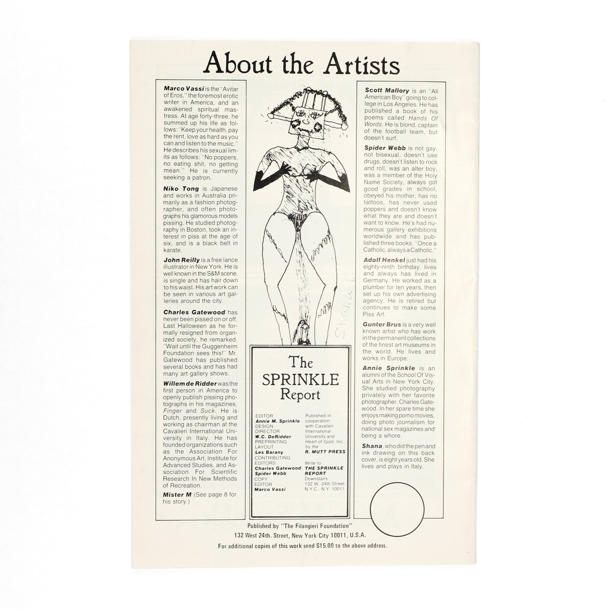 Fetish-oriented artist's publication devoted to the self-styled "Piss Art movement." Created and edited by American performance artist, sex educator, and pornographic actress Annie Sprinkle (b. 1954), with "design direction" by Sprinkle's frequent collaborator, Dutch artist and Fluxus founding member Willem De Ridder (1939-2022). Explicitly illustrated throughout with black-and-white photographs and drawings, and featuring contributions from Sprinkle, Marco Vassi, Niko Tong, John Reilly, Charles Gatewood, Spider Webb, Willem de Ridder, Adolf Henkel, Günter Brus, et al. Though billed as "Volume 1, No. 4," this reportedly the first and only issued published. Much scarcer in the trade than suggested by its generous limitation. OCLC locates just two holdings, at MoMA and Harvard.