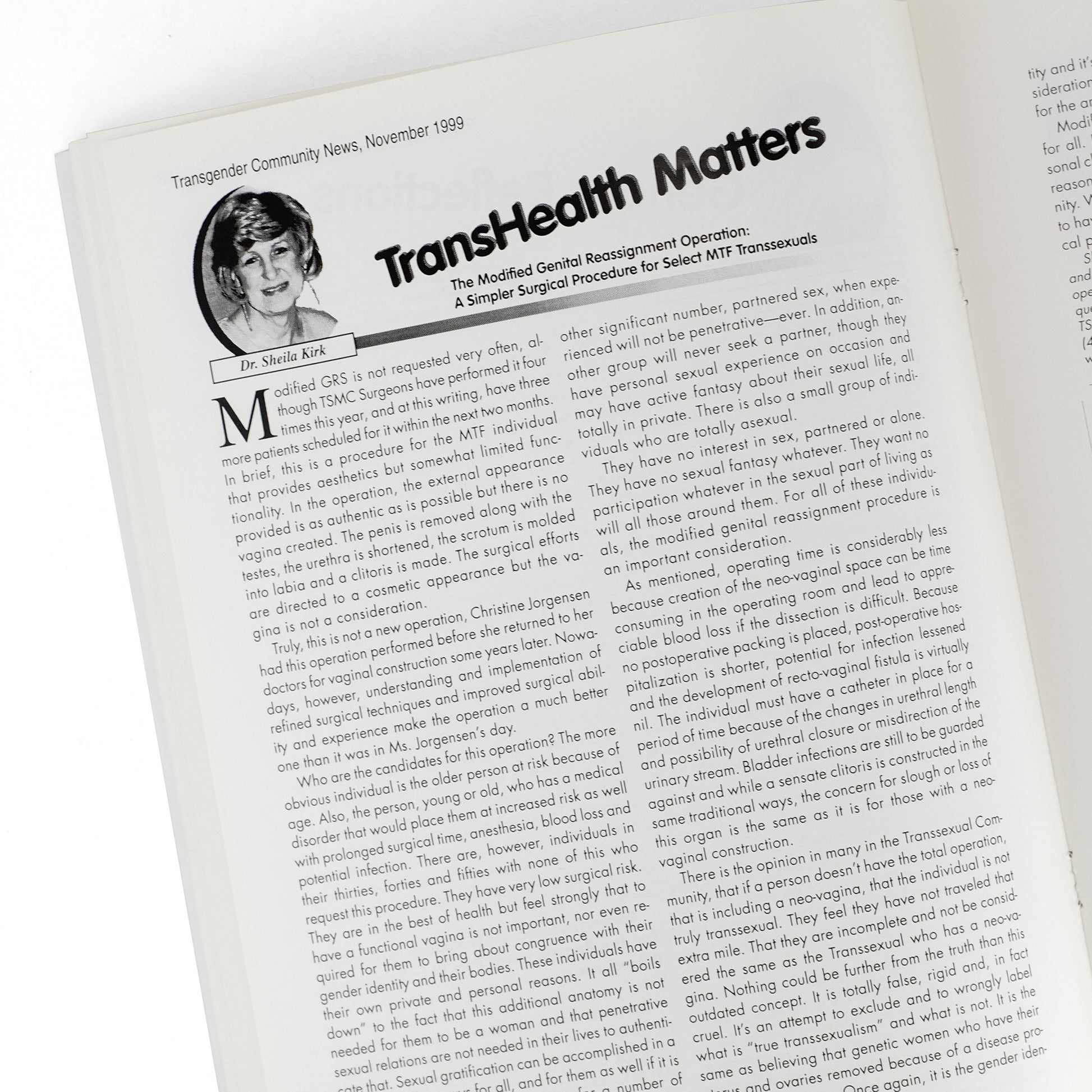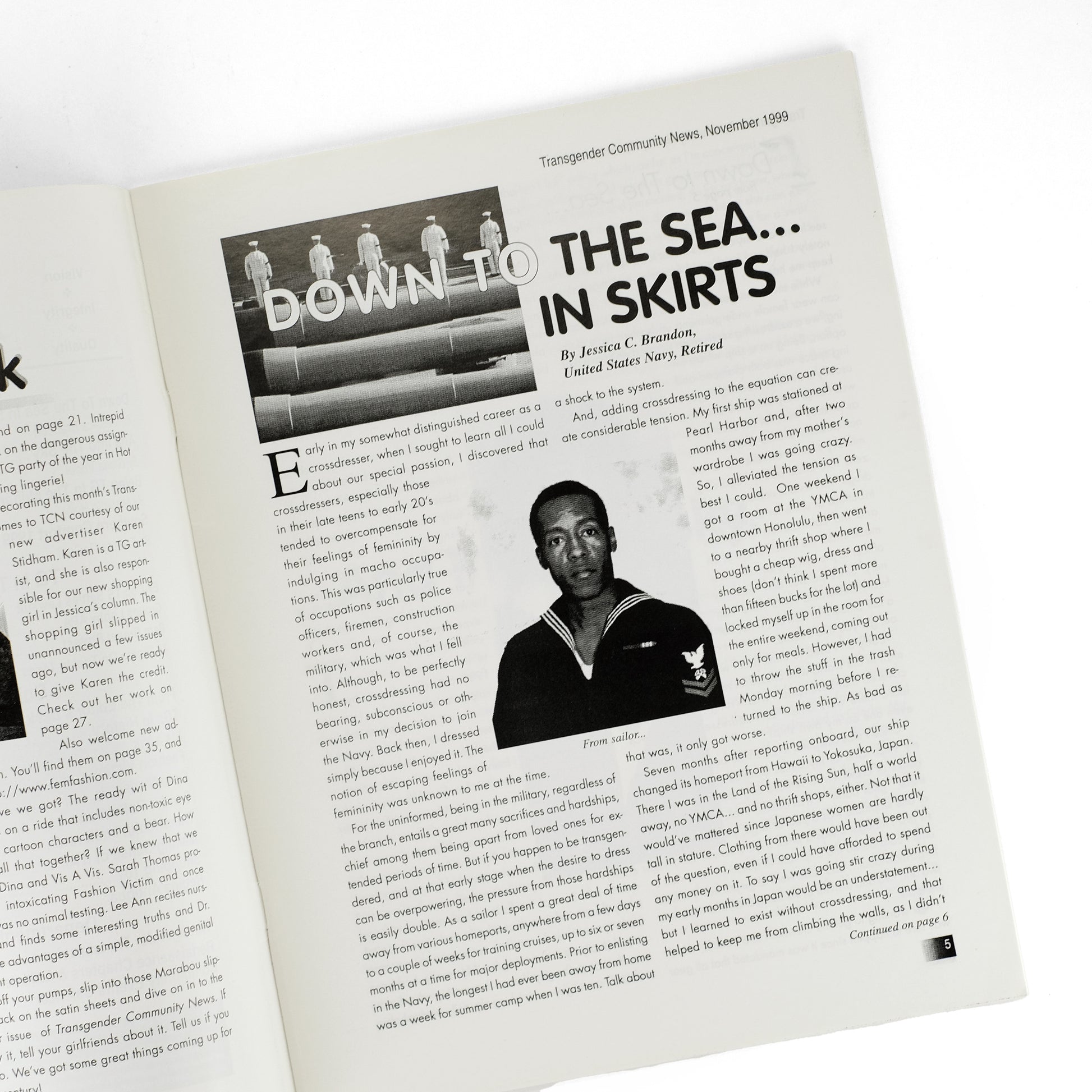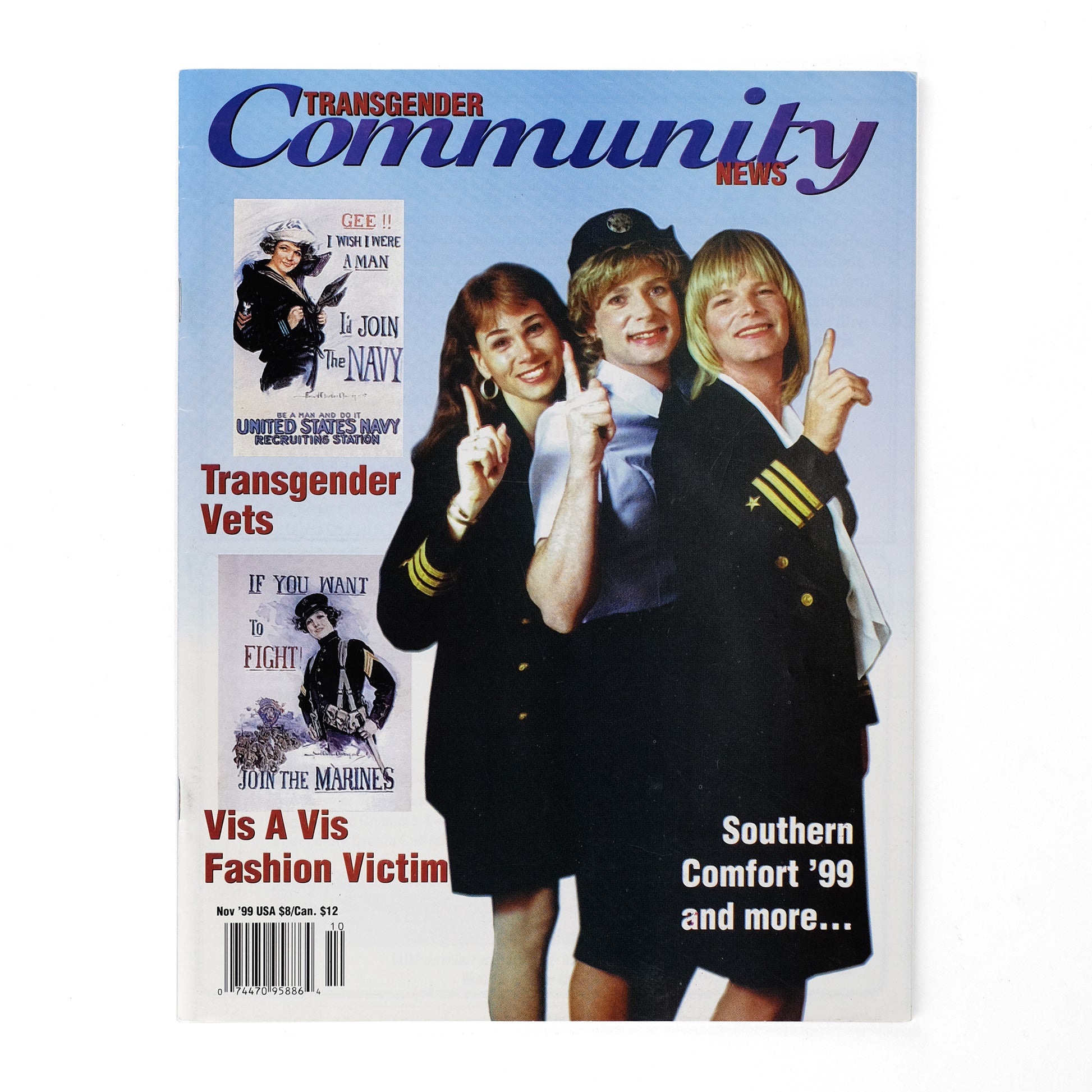Single issue of this transgender community and support periodical, the official publication of the Renaissance Transgender Association. This issue featuring three articles exploring trans experiences in the military ("Down To The Sea In Skirts," by Jessica Brandon, "And Into The Sky," by Gloria Vogel, and "Being TG In The Military," by Michelle Holly). Also a report on the 1999 Southern Comfort Convention, ten columns, news reports, etc. Illustrated and with black-and-white ads throughout. Editor Gardner a founding member of the Renaissance Transgender Association, also notable as the long-serving editor of groundbreaking website TGForum. This periodical somewhat uncommon in the trade.