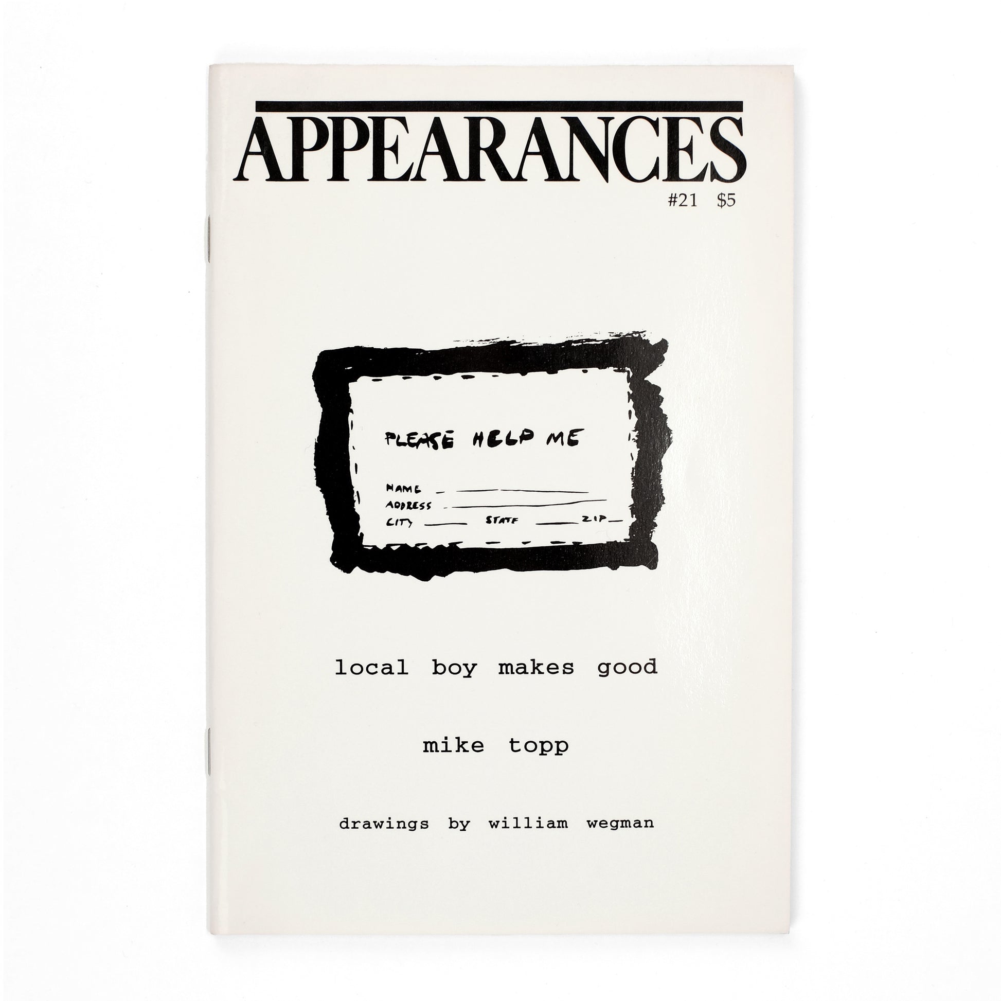 A collection of short prose works in Topp's distinctive style, insouciant and subversively banal. Cover and two interior illustrations by William Wegman. Issued as the twenty-first issue of Appearances, the NY little mag of arts and literature edited by Robert Witz. Laid into this copy is a single folded sheet, dated in year of publication, with holograph text in Topp's hand: "Hi I hope you enjoy this. Mike Topp," followed by his New York address.