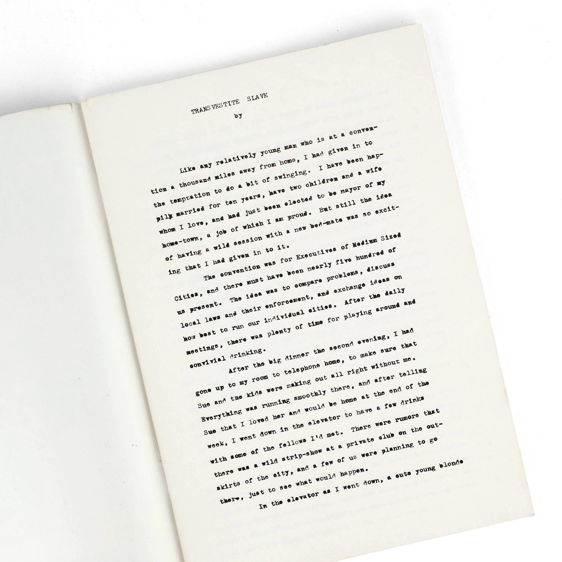 Anonymous transvestite fiction, unillustrated save for the front cover. With a list of other Mutrix/Wholesale titles at rear, and advertisements for books illustrated by Eric Stanton and Eneg (Gene Bilbrew) to back cover.