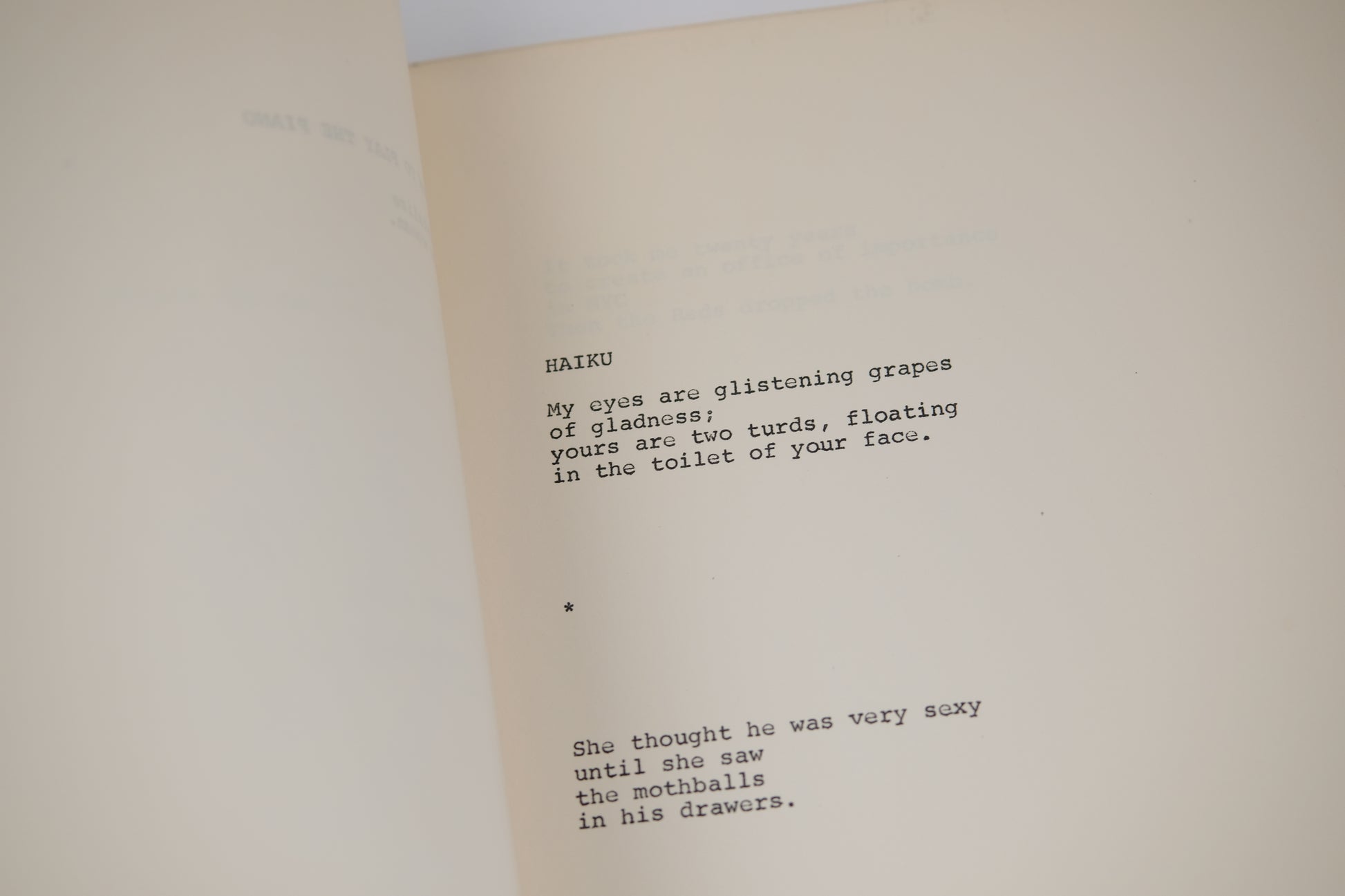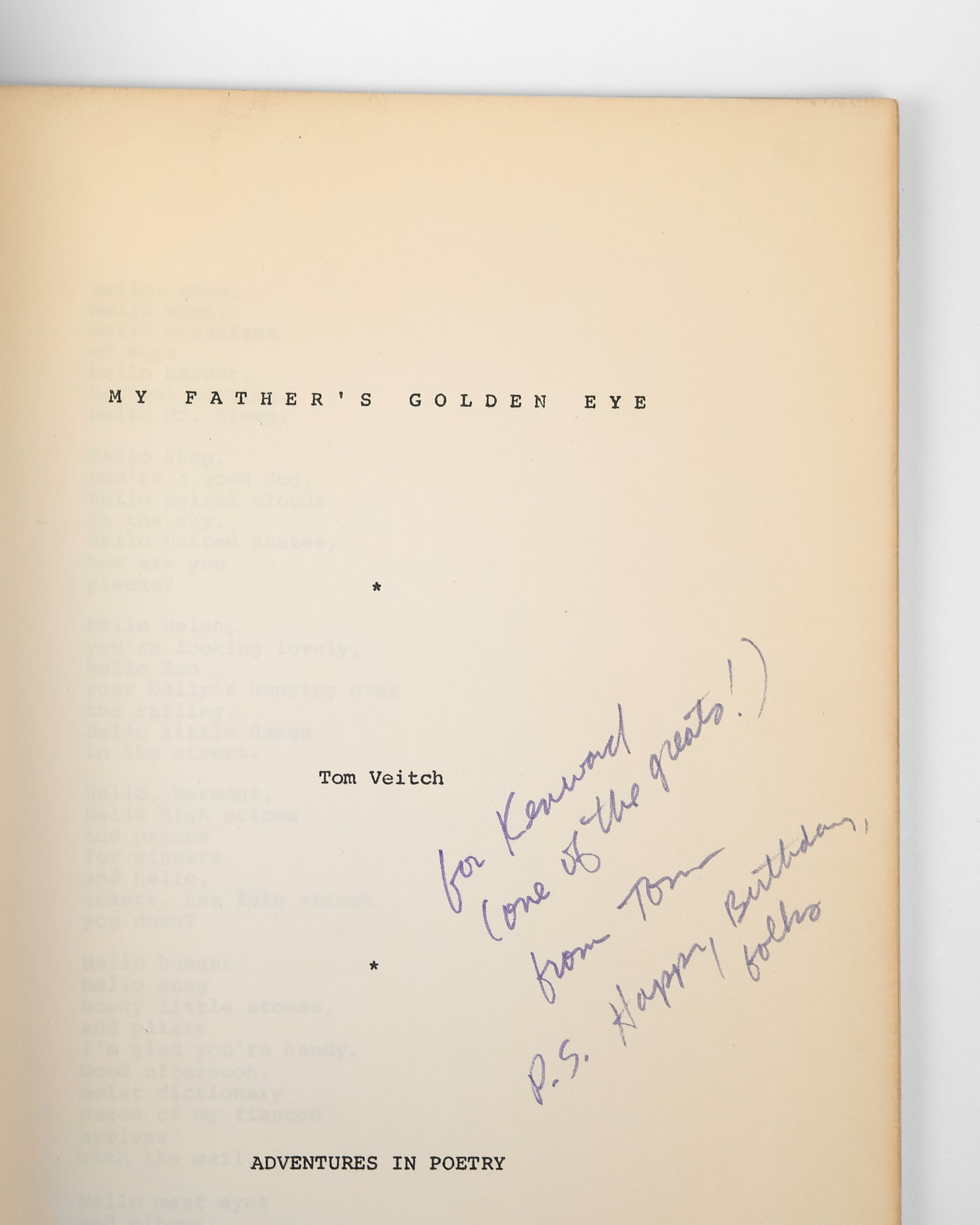 Inscribed assocation copy of this collection of verse by American poet and comic book writer Tom Veitch (1941-2022). From the library of New York School poet, librettist, and publisher Kenward Elmslie (1929-2022), and inscribed to him by Veitch on the title page: “For Kenward [Elmslie] (one of the greats!) from Tom P.S. Happy Birthday, folks.” The first stand-alone publication of Larry Fagin’s Adventures in Poetry imprint.