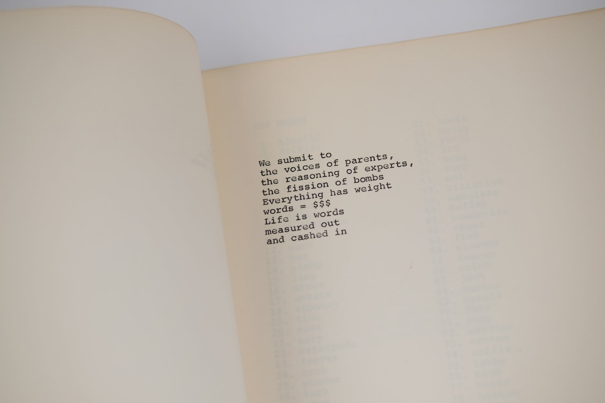 NY: Adventures in Poetry, 1970. Edition of 300. [44] leaves, printed rectos only. 4to. Side-stapled in photo-illustrated wraps. Wear and curling to corners; soiling to rear cover. Very good.