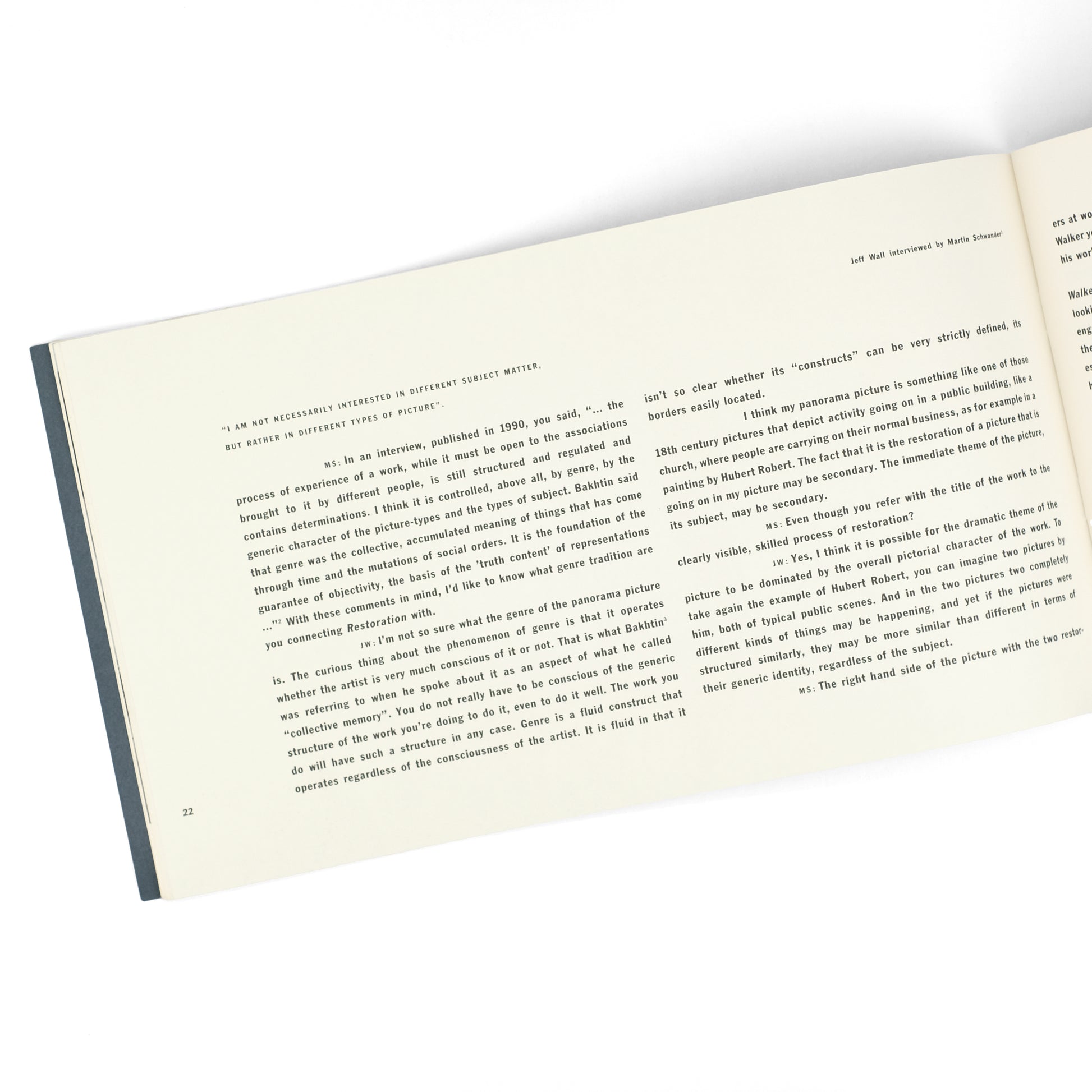 Catalog documenting the background and execution of the 1993 Jeff Wall work Restoration, a panoramic photograph depicting the restoration of the Bournaki panorama in Lucerne, Switzerland. With a foreword by Martin Schwander and Jurgen Harten, a history of the Bourbaki Panorama by Martin Schwander, an interview with Wall, and an essay by Arielle Pélenc; biography, list of exhibitions, and bibliography at rear. All text in both German and English, with the Pélenc essay also in French.