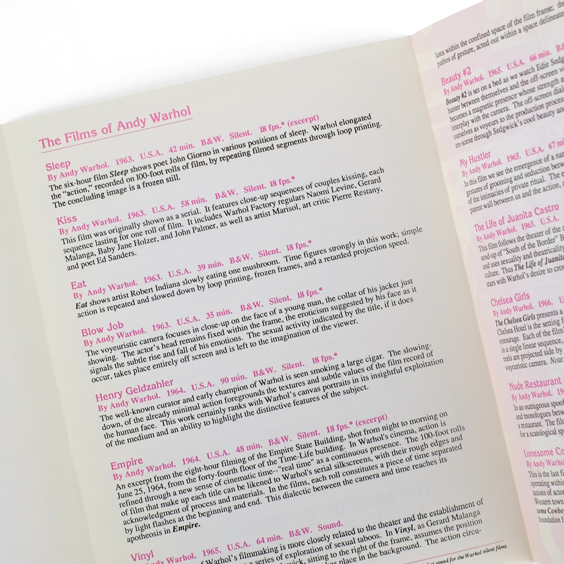 A catalog of films by American artist Andy Warhol (1928-1987) available for distribution through MoMA's Circulating Film Library. Produced as part of the Andy Warhol Film Project, a "comprehensive plan to preserve, exhibit and distribute the films of one of America's foremost artists" (introductory statement by John G. Hanhardt. With descriptions and running times of thirteen films, and instructions at rear for the split-screen projection of Chelsea Girls. Uncommon.