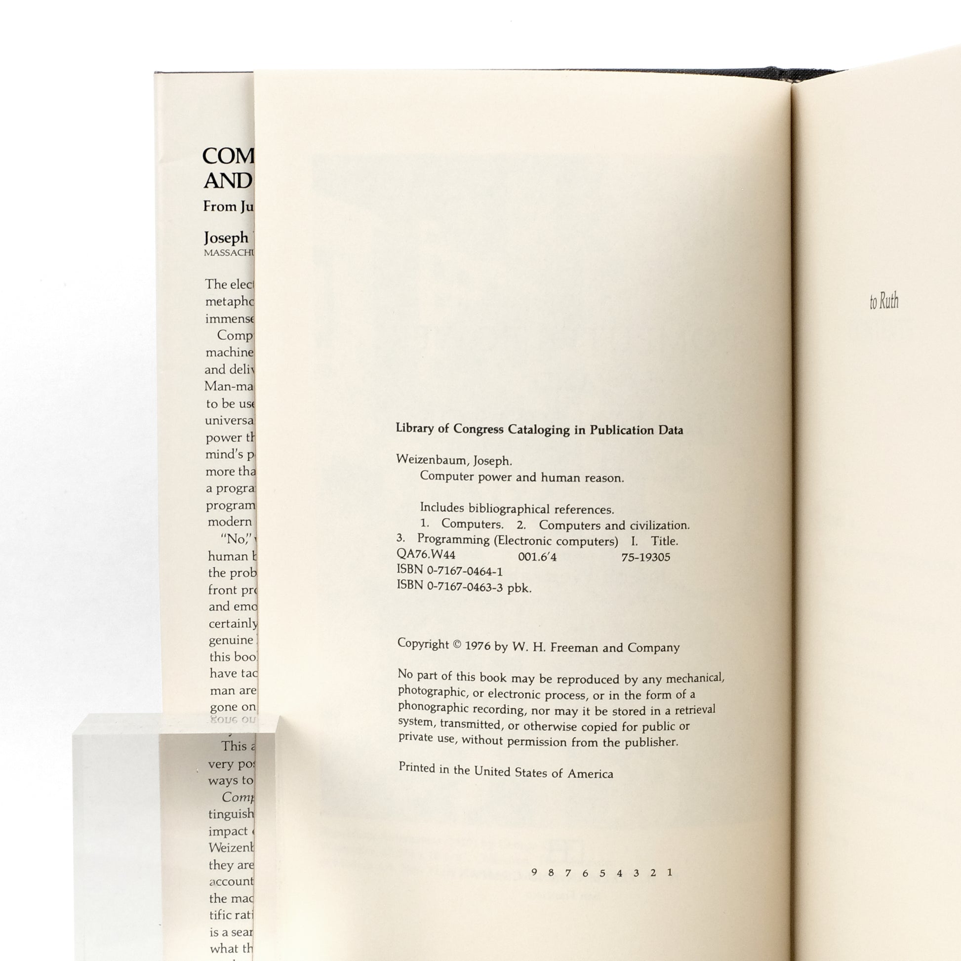 Sharp first printing of this important work of scientific ethics by German-American computer scientist Joseph Weizenbaum (1923-2008), a key figure in the history of artificial intelligence. In 1966, Weizenbaum created the natural language processing system ELIZA, which utilized pattern-matching rules to generate replies, making it in essence the first chatbot—a direct predecessor to the AI technology of today. Here Weizenbaum gives voice to his concerns about the blind optimism he saw, from colleagues and lay-people alike, regarding AI's potential to mimic the functioning of the human brain. The very concept of "artificial intelligence," he argues, insofar as it raises machines to the status of human beings, represents a form of technological imperialism, reducing human beings to mere machines. The book rests on his central distinction that, while artificial intelligence is capable of making decisions, which are based on calculations, it remains fundamentally unable to make choices, which are based on judgments—a purely human facility. A work of vital importance, particularly in our current climate where technology's ideologues seem less comfortable than ever engaging with the philosophical implications of their creations.