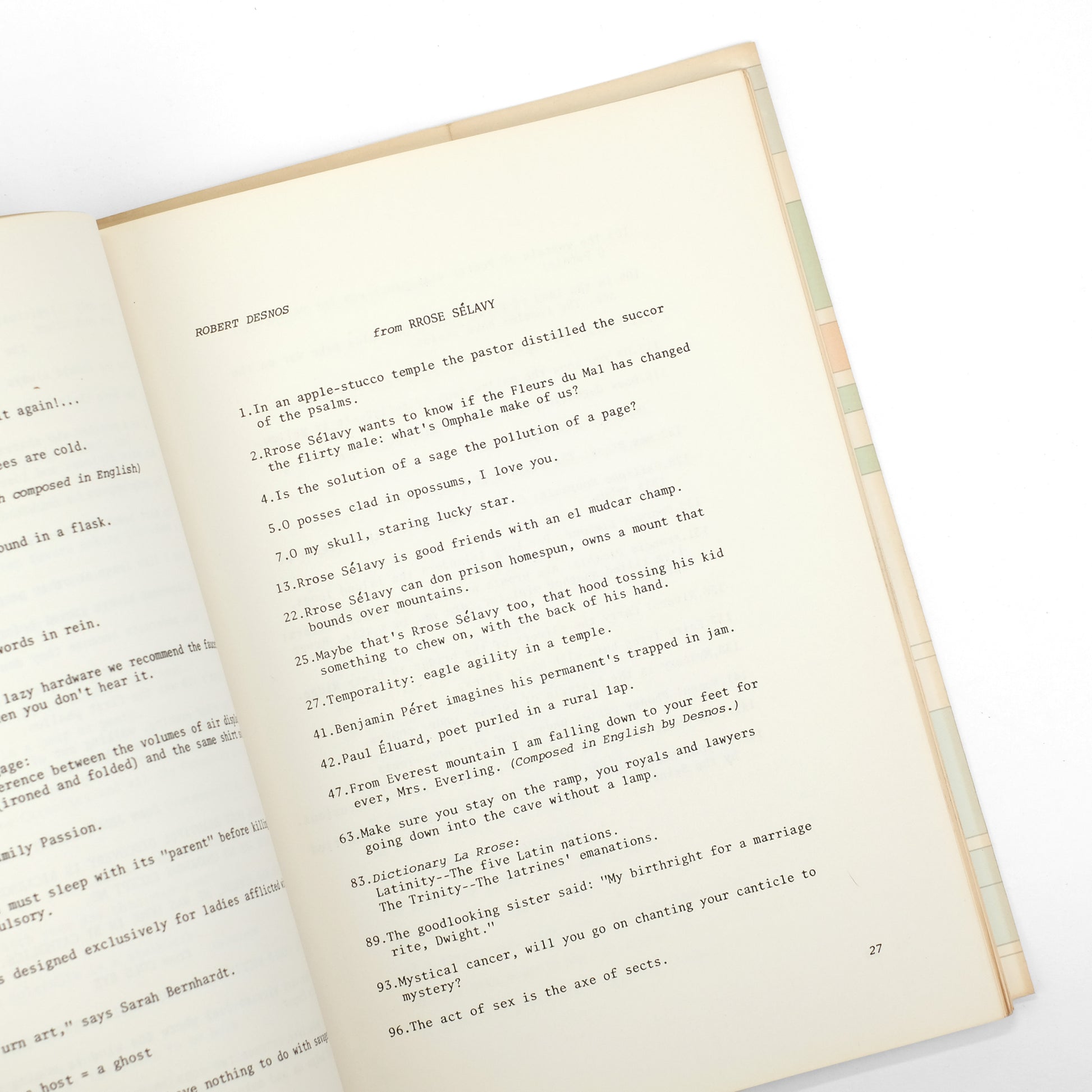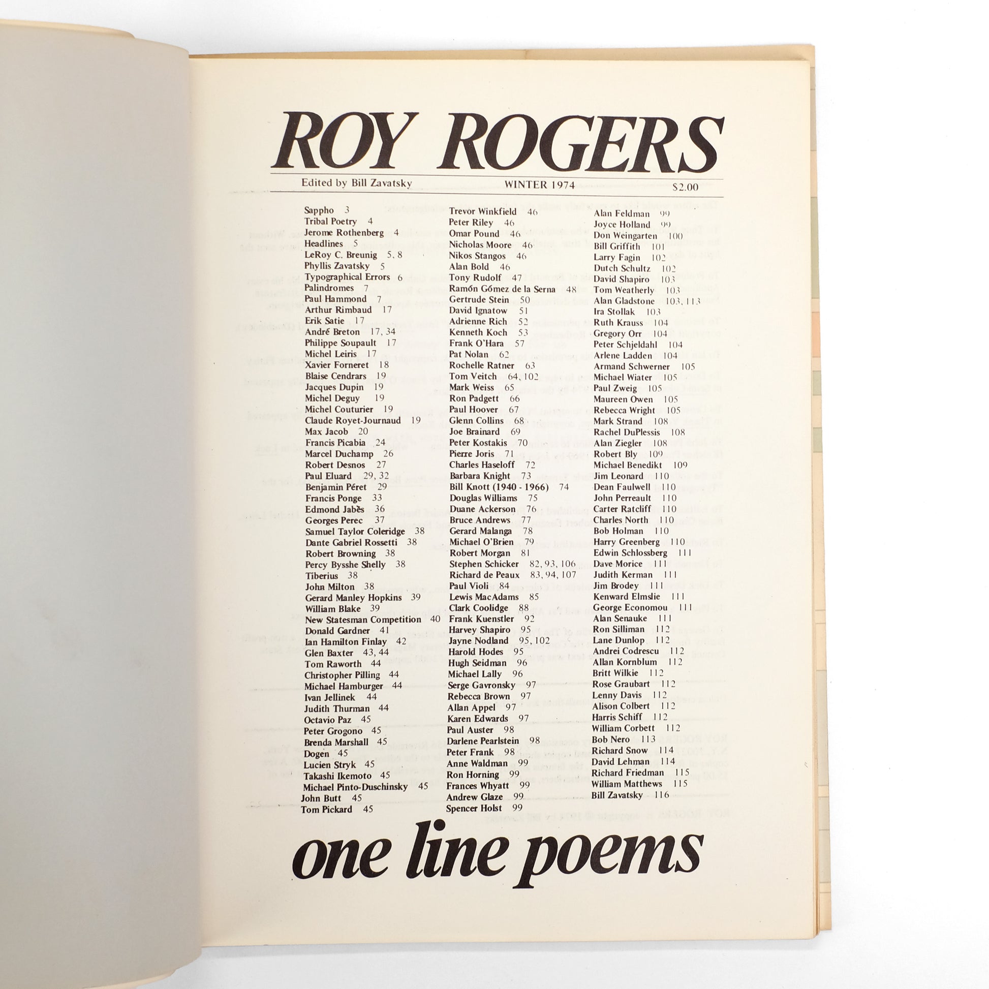 Final issue of this little mag of poetry and literature, whose first five issues were produced as giveaway spinoffs of Sundial, before settling into this larger format for its last two issues. Contents, per its title, consist of one-line poems by over one hundred contributors, including Paul Auster, Peter Schjeldahl, Anne Waldman, Ron Silliman, Clark Coolidge, Robert Desnos, Francis Picabia, André Breton, Erik Satie, Adrienne Rich, Frank O'Hara, Ron Padgett, Joe Brainard, Ian Hamilton Finlay, et al. With one illustration by Barbara Knight, and three two-color serigraphs by Richard De Peaux, the first signed and numbered by to verso. Nice copy.