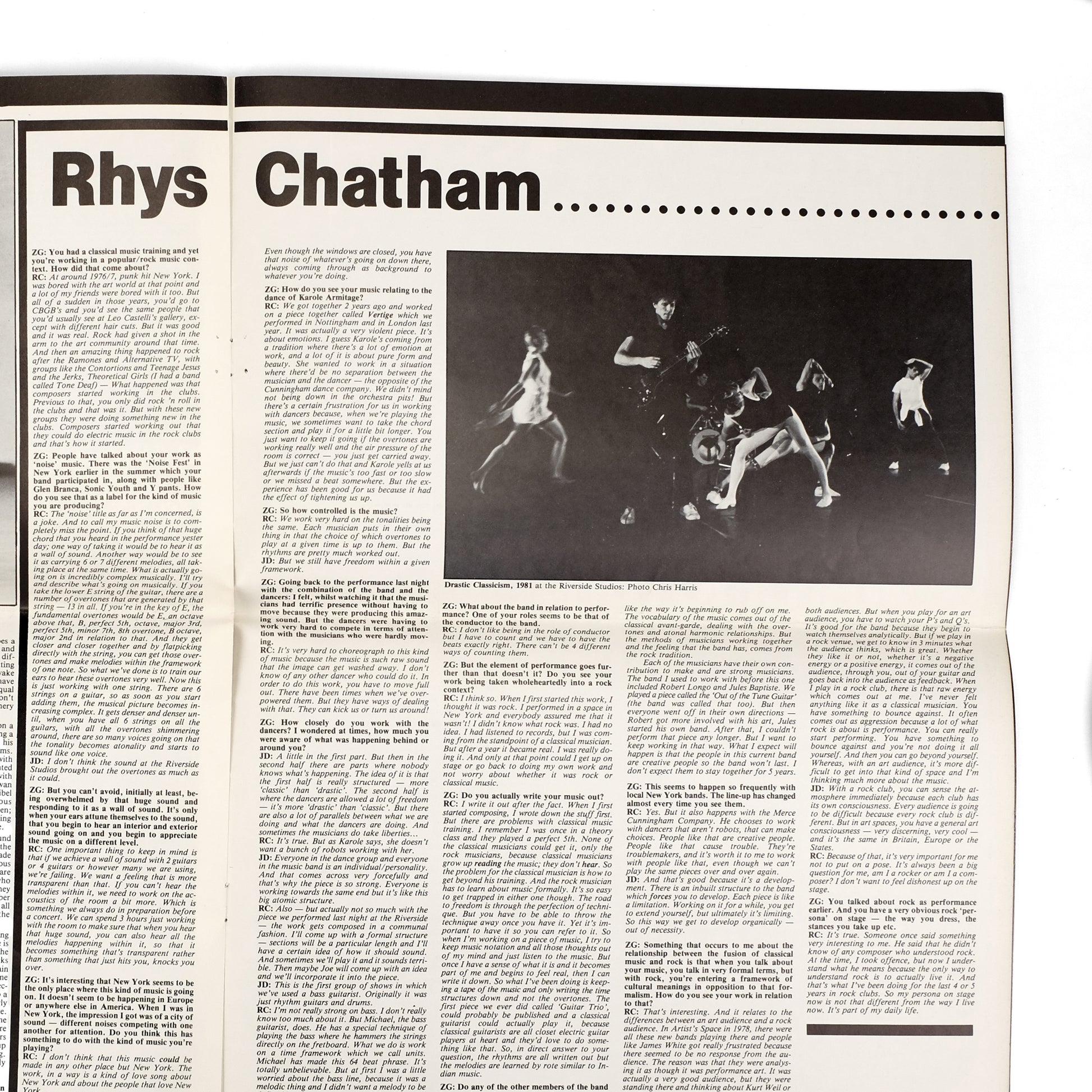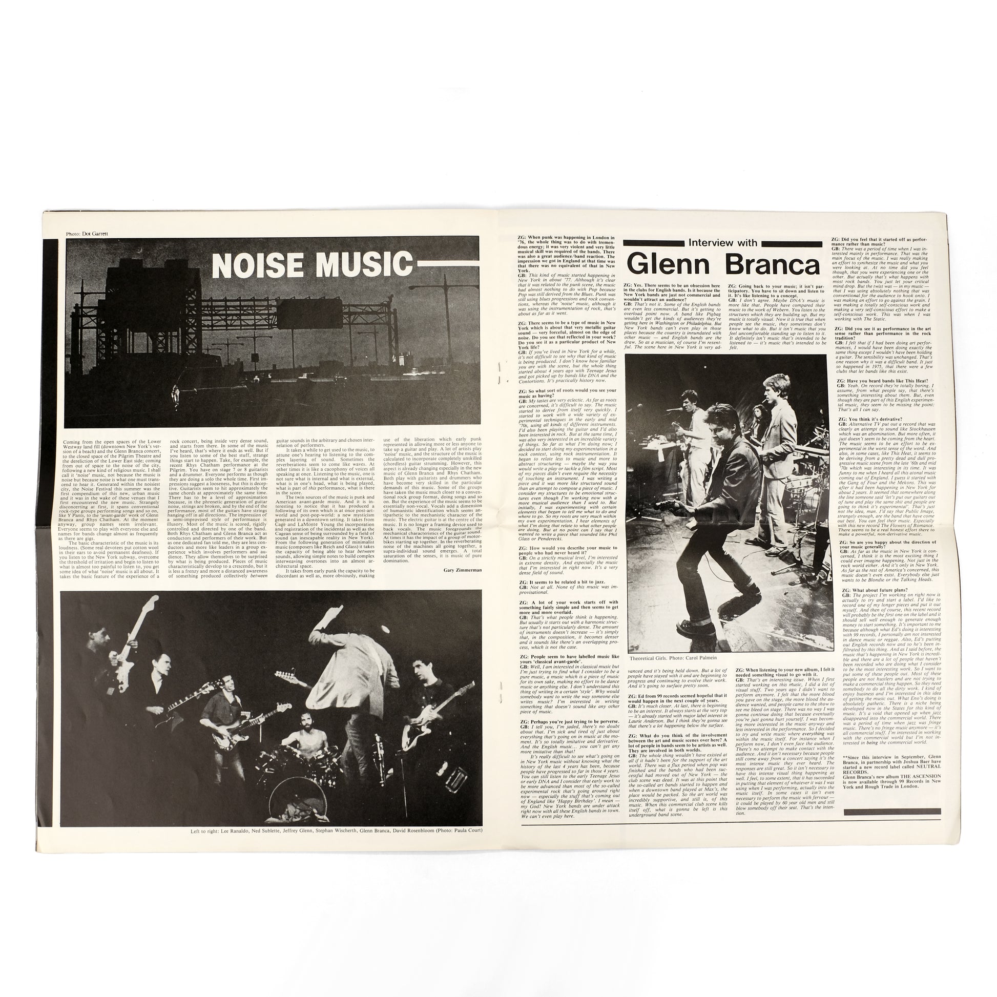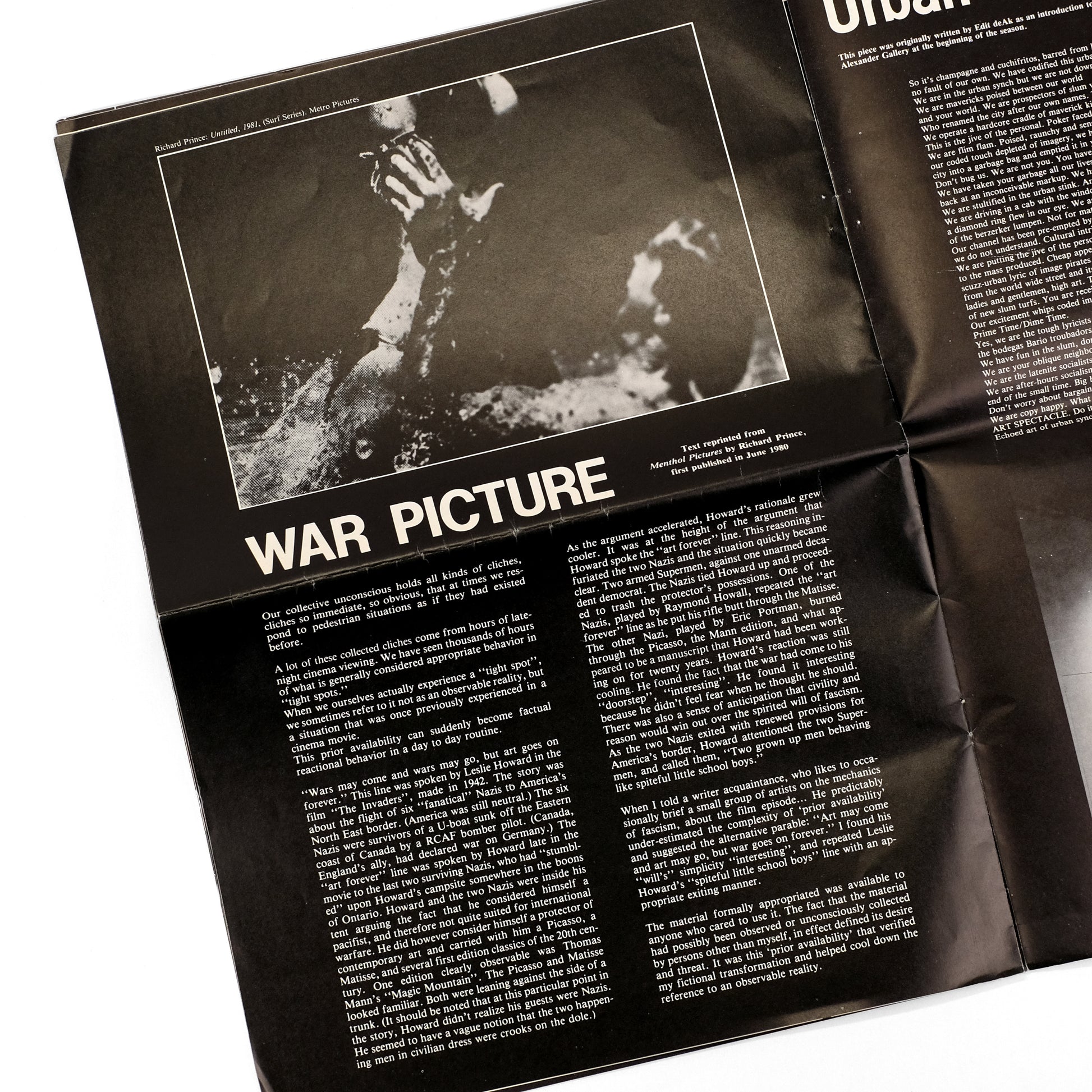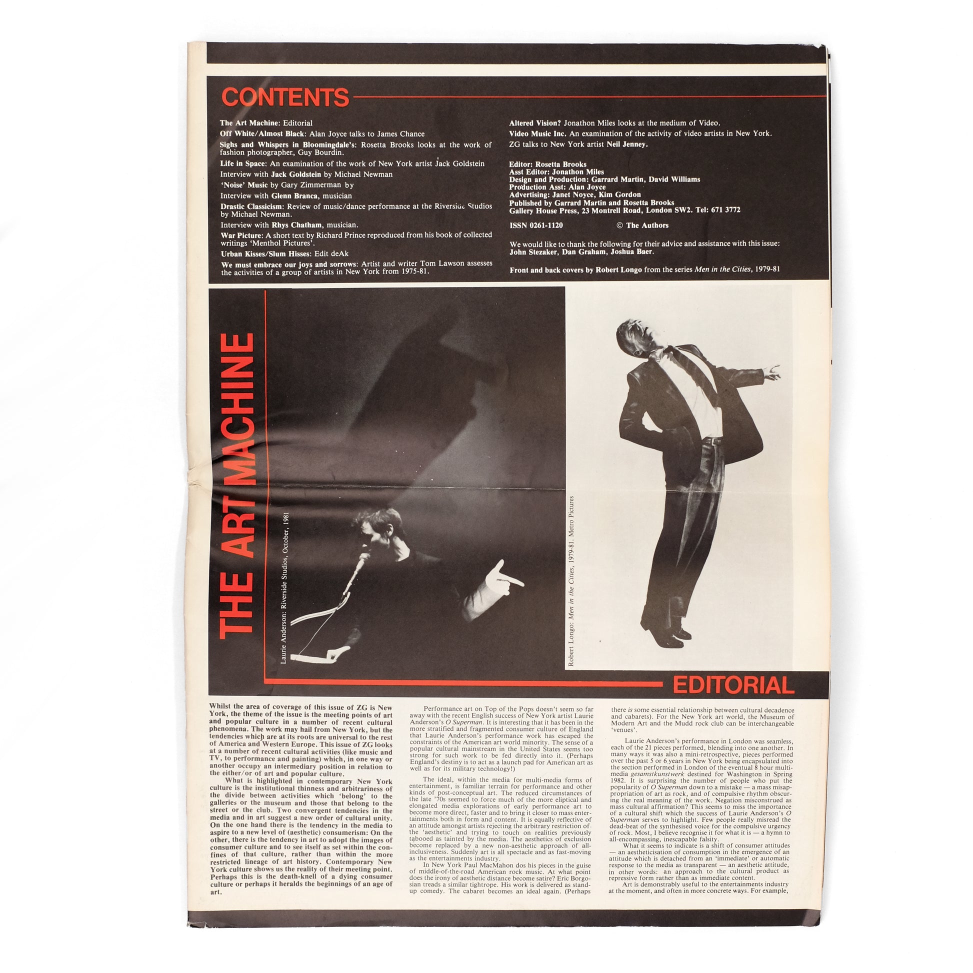 Fifth of fifteen total issues of this edgy UK artists' periodical comprised of "critical writings and artists' projects, approaching visual art as one facet of a wider arena of cultural production including fashion, punk music, and television" (Allen, Artists' Magazines, p. 313). This issue covering the New York art and music scene, with features including an interview with No Wave saxophonist James Chance; a review of a Bloomingdale mail-order lingerie catalogue by Rosetta Brooks; a profile of performance and conceptual artist Jack Goldstein, including interview; an article on noise music by Gary Zimmerman; an interview with avant-garde composer and guitarist Glenn Branca; an interview with vant-garde composer and guitarist Rhys Chatham; a Richard Prince text with illustration reprinted from Menthol Pictures (1980); an article on the New York art scene by Real Life editor Thomas Lawson; an article on avant-video arts by Jonathan Miles; an interview by John Sanborn of video artist Dara Birnbaum; an interview with painter Neil Jenney, etc.